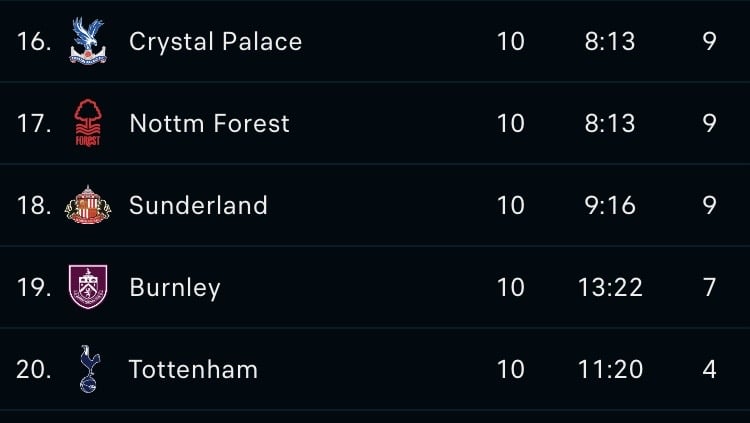 Spurs have 10 matches left. They haven't won any of their last 10 and picked up just 4 points. A similar return will mean that West Ham will need 9 points and Forest will require 6 points to survive. Both have achieved more than that in their last 10 games.