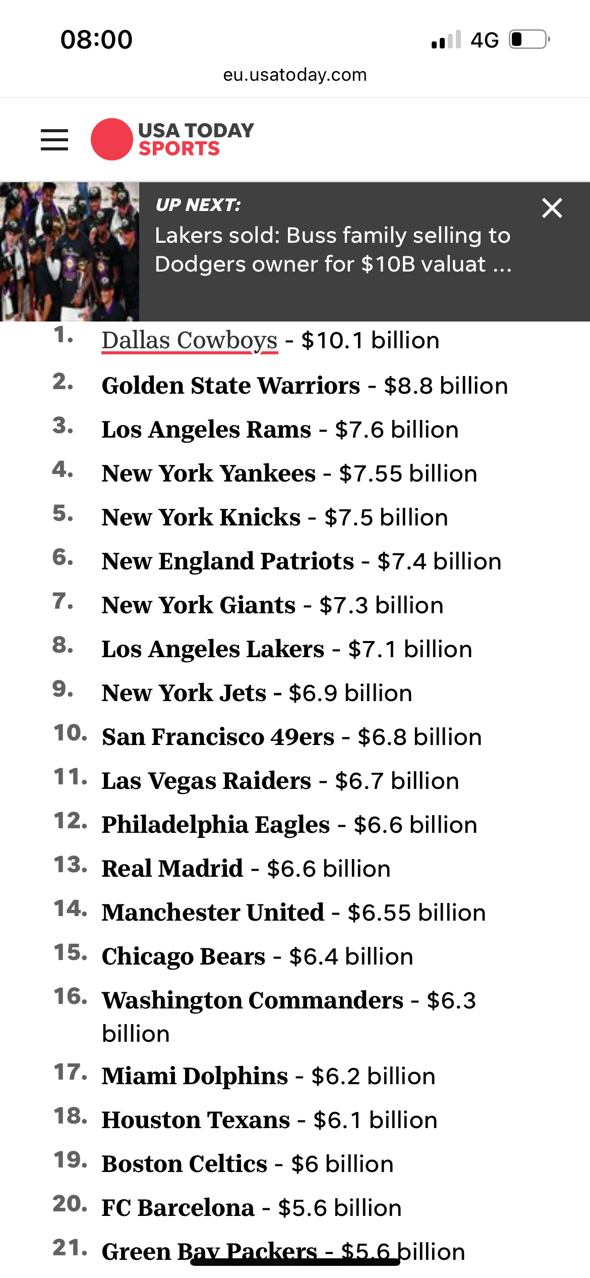 Most valuations / estimates of sports franchises and teams worldwide usually pegs the Dallas Cowboys as being right up there as well.0 -
