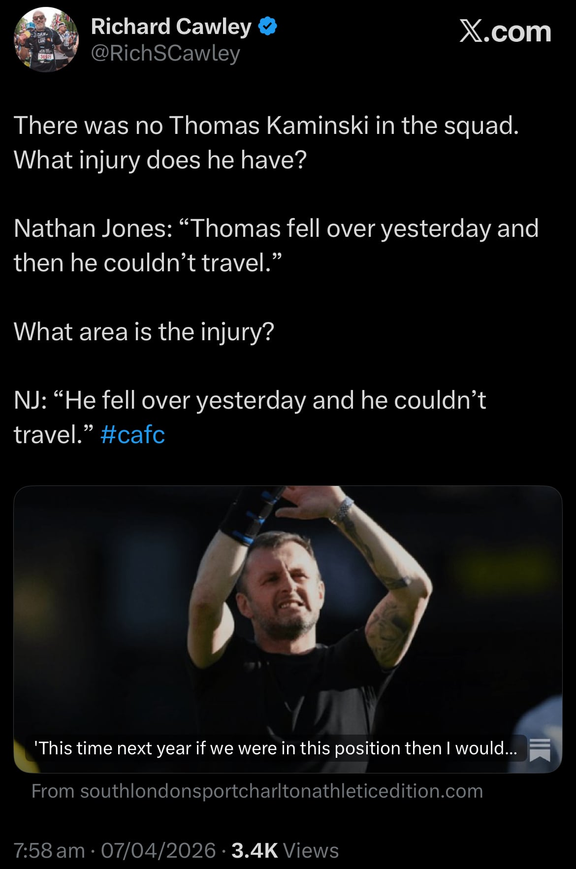 Cawley certainly didn't seem to buy itDanny Addick said:Jones: “Thomas fell over yesterday and then he couldn’t travel.”Hmm0 -