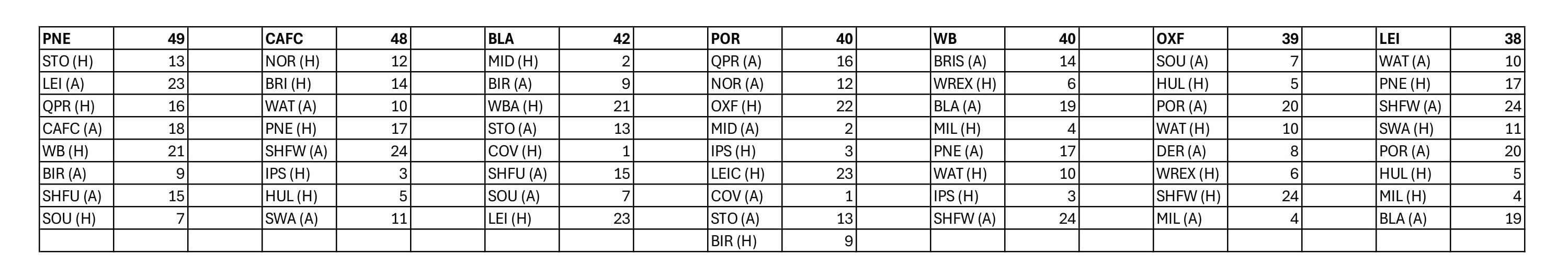 I'm bored at work so made up a table of remaining games for teams around us, number of points and league table position of the opponents they are playing.8 -