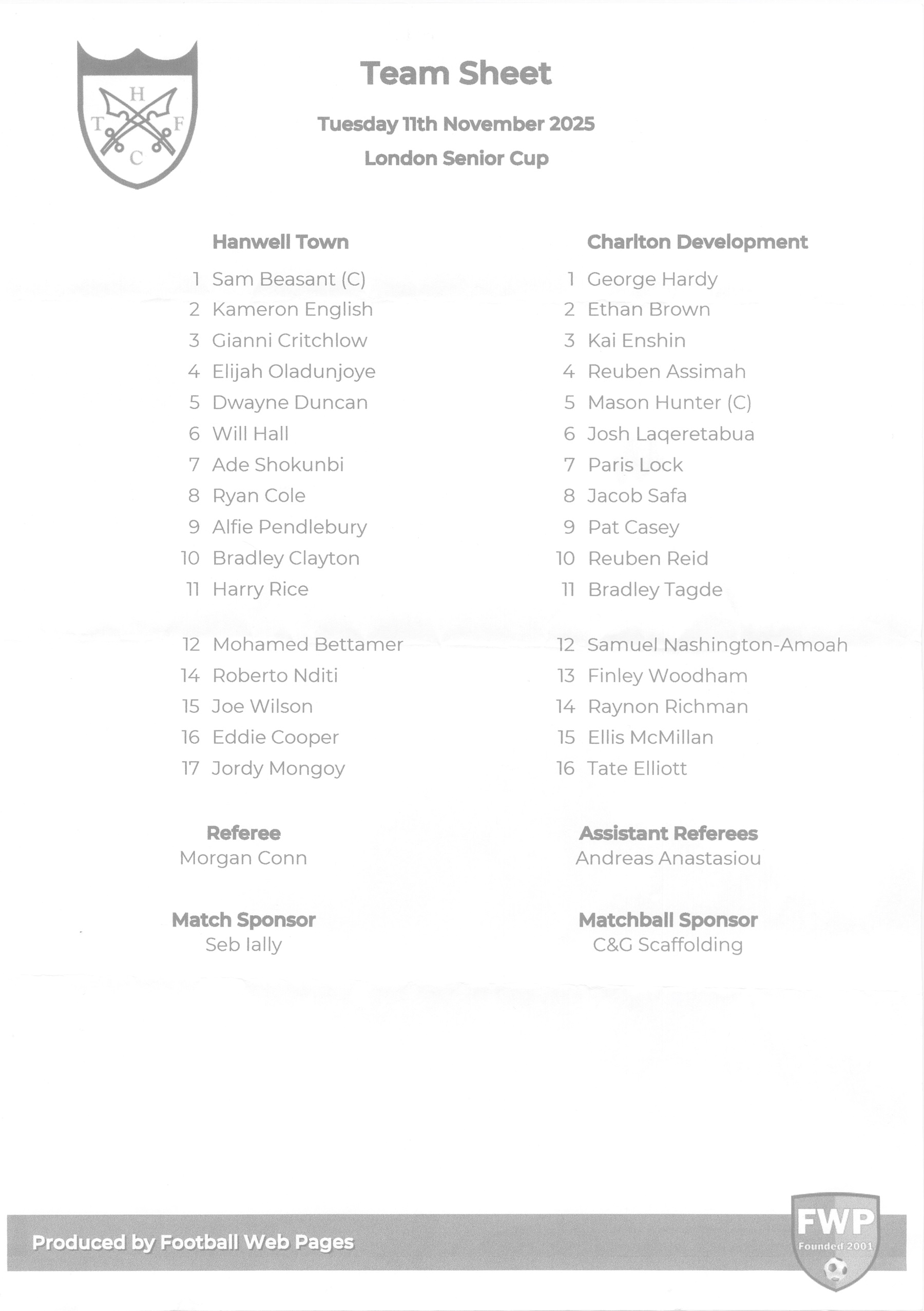 London Senior Cup - R2: Hanwell Town (A) Tuesday 11th November 7:45pm