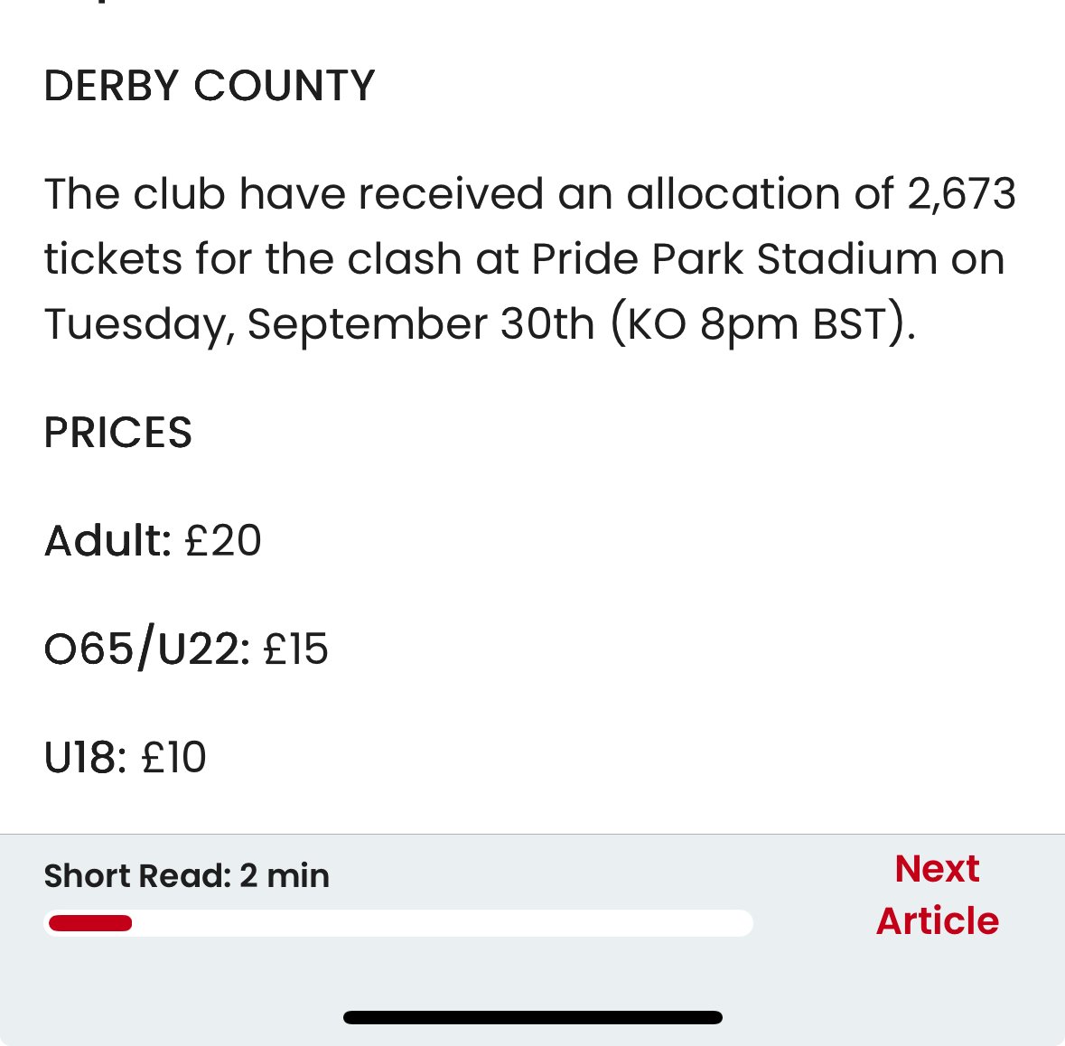 The club have received an allocation of 2,673 tickets for the clash at Pride Park Stadium on Tuesday, September 30th (KO 8pm BST).