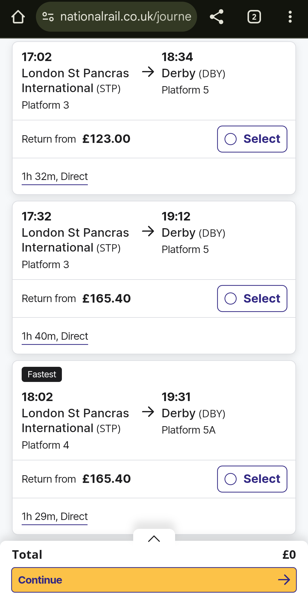 Train departs Derby 22.20 arrives St Pancras 00.23
