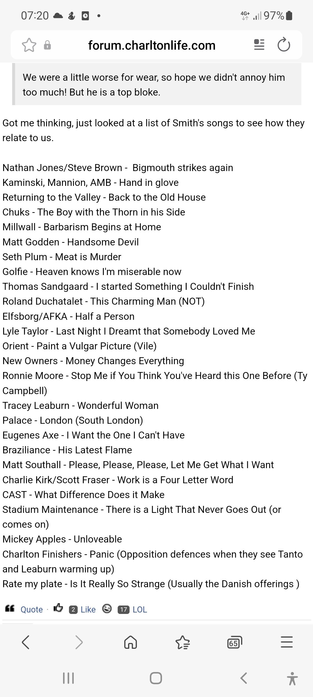 Just put on the Blackburn post match thread how Smith's songs relate to us,