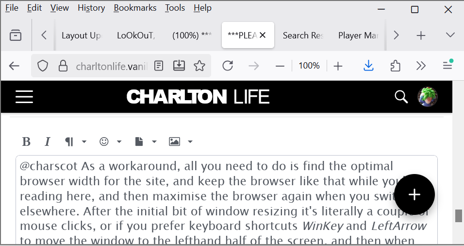 • @charscot As a workaround, all you need to do is find the optimal browser width for the site, and keep the browser like that while you're reading here, and then maximise the browser again when you switch elsewhere. After the initial bit of window resizing it's literally a couple of mouse clicks, or if you prefer keyboard shortcuts WinKey and LeftArrow to move the window to the lefthand half of the screen, and then when you're done WinKey and UpArrow and WinKey and UpArrow  again to restore it to the full screen area (if you only do it once you end up with the window just in the top lefthand corner of the screen which looks a bit silly)
