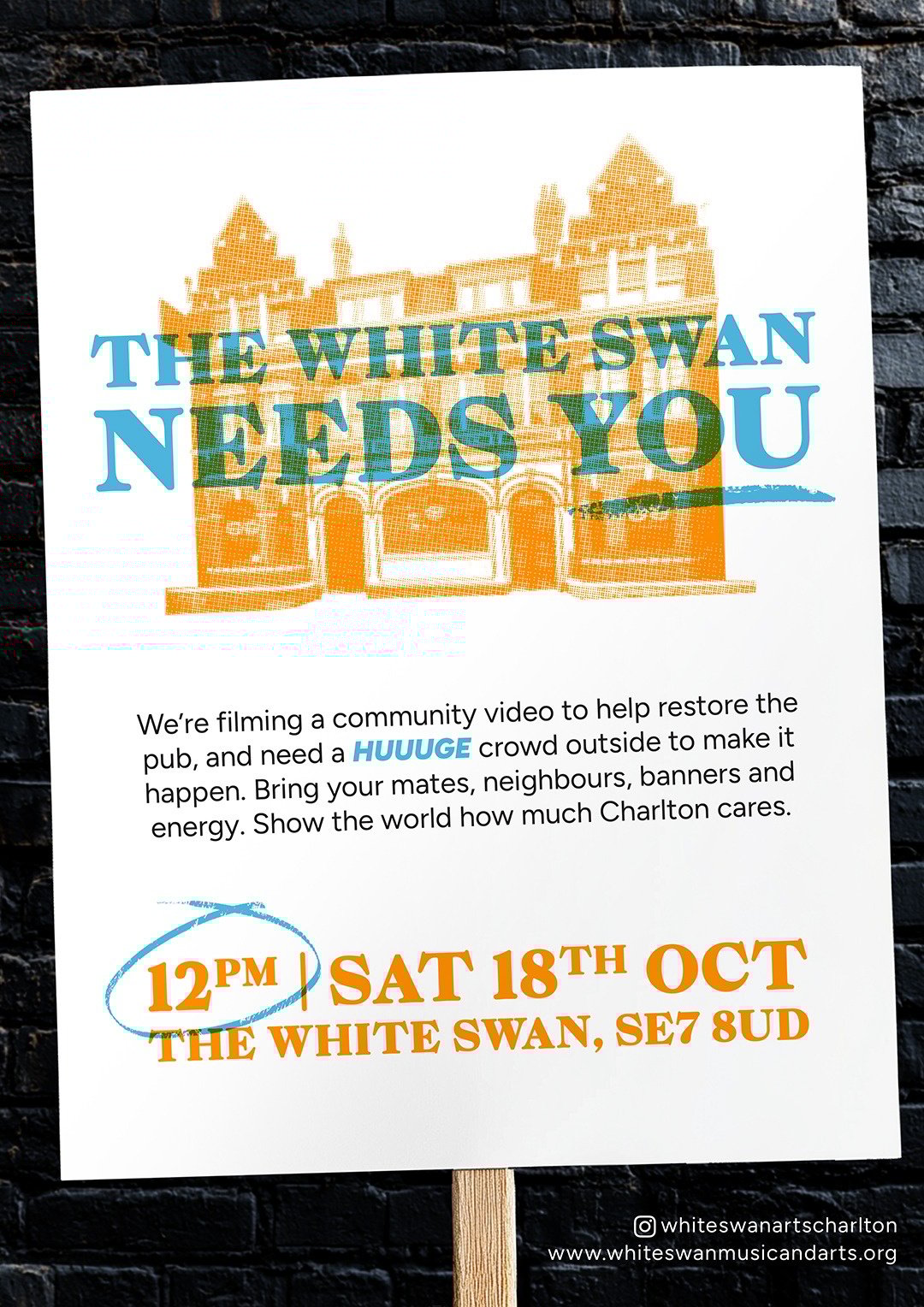 A local group is trying to restore The White Swan in Charlton Village and keep it open long-term as a community run venue. They need to shoot a giant crowd scene outside the pub to kick off an upcoming campaign. Hoping we can get as many Addicks as possible on Saturday afternoon before the big game against Wednesday.