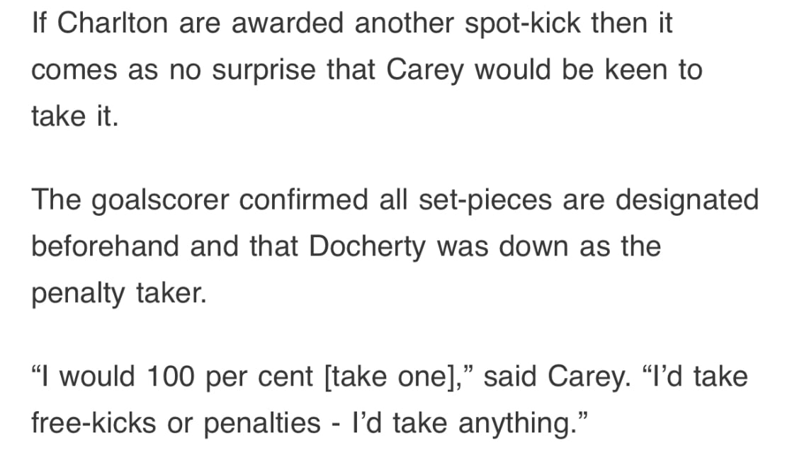 If Doc was the dedicated penalty taker he would have picked the ball up or have been given it straight away. That looked like a nobody wanted it scenarioAthletico Charlton said:SteveACS said:Just a comment about the penalty...