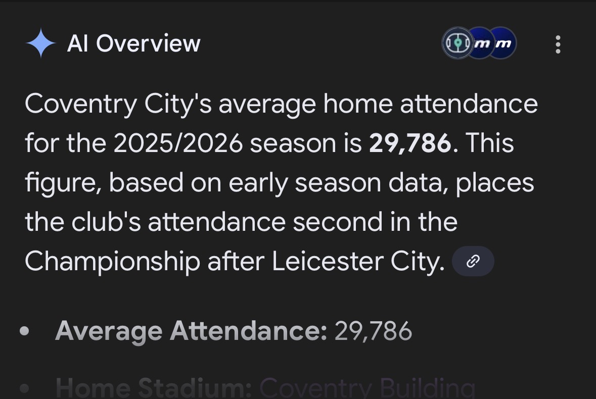 32,600 capacity. 29,800 average attendance. Why would they need to withhold the 700 away fan section ‘9’ to sell to home fans ? I know we’ve been known to occasionally sing we are the greatest team the world has ever seen but I doubt even the citizens of Coventry really believe that.