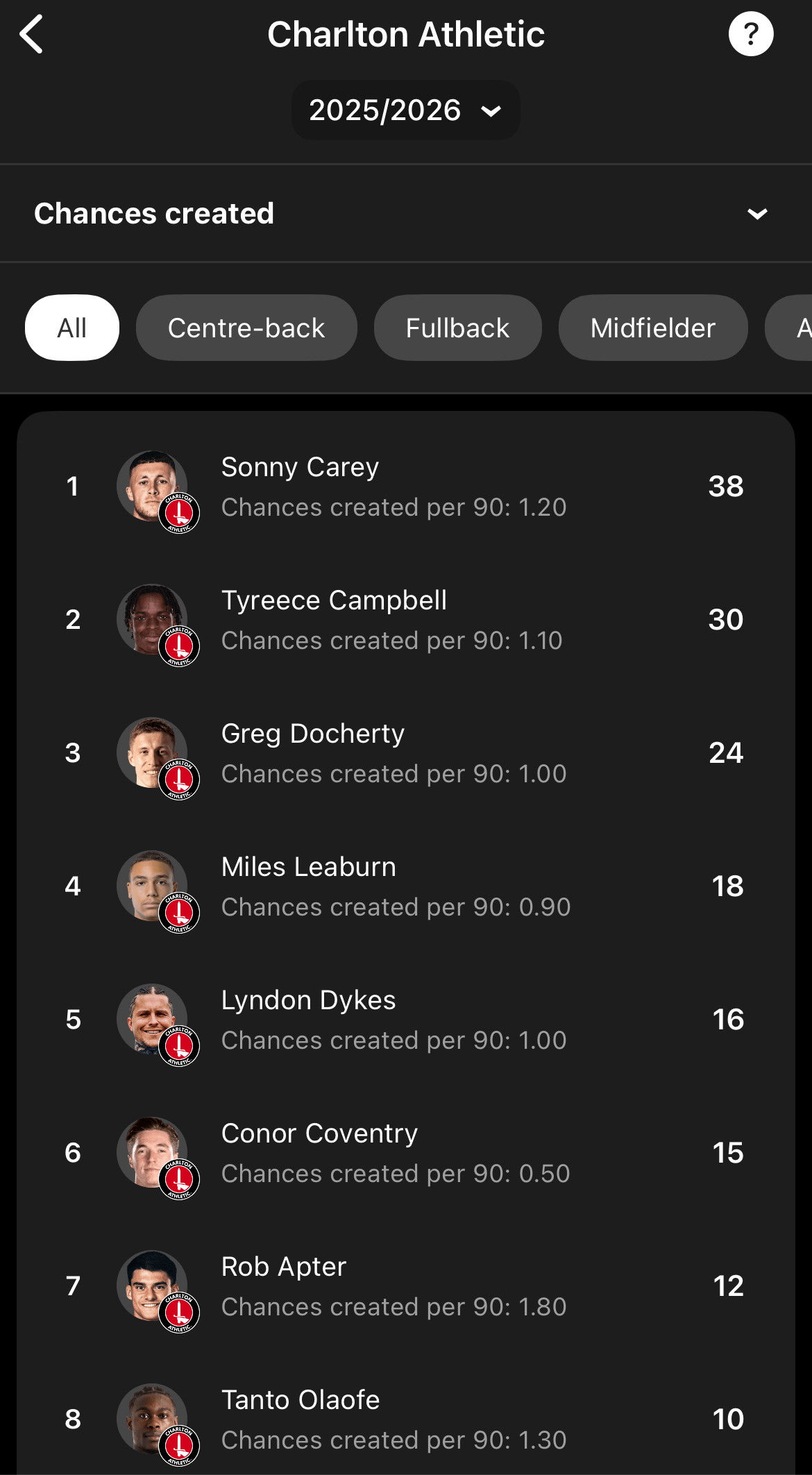 I think the problem is no-one is really creating much. Docherty 3rd on the list despite being mostly defensive. Apter and Tanto making the list despite hardly playing and being out on loan since Jan. Carey top of the list, when the biggest criticism of him is not getting his head up and passing.