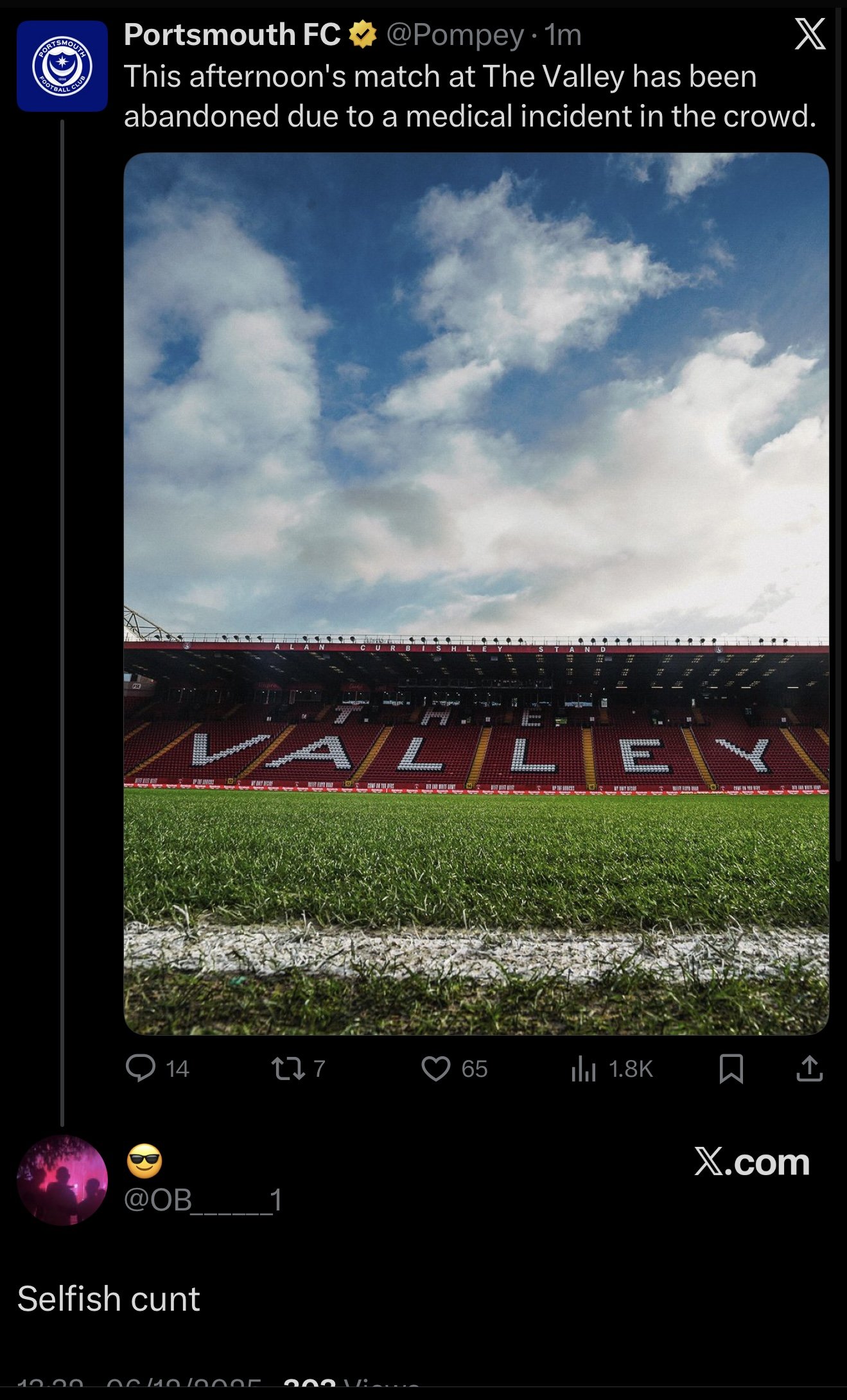 Hoping the best for the affected fellow Addick. Thinking of them and their loved ones, as well as all those that witnessed the distress and those that did their best to help.11