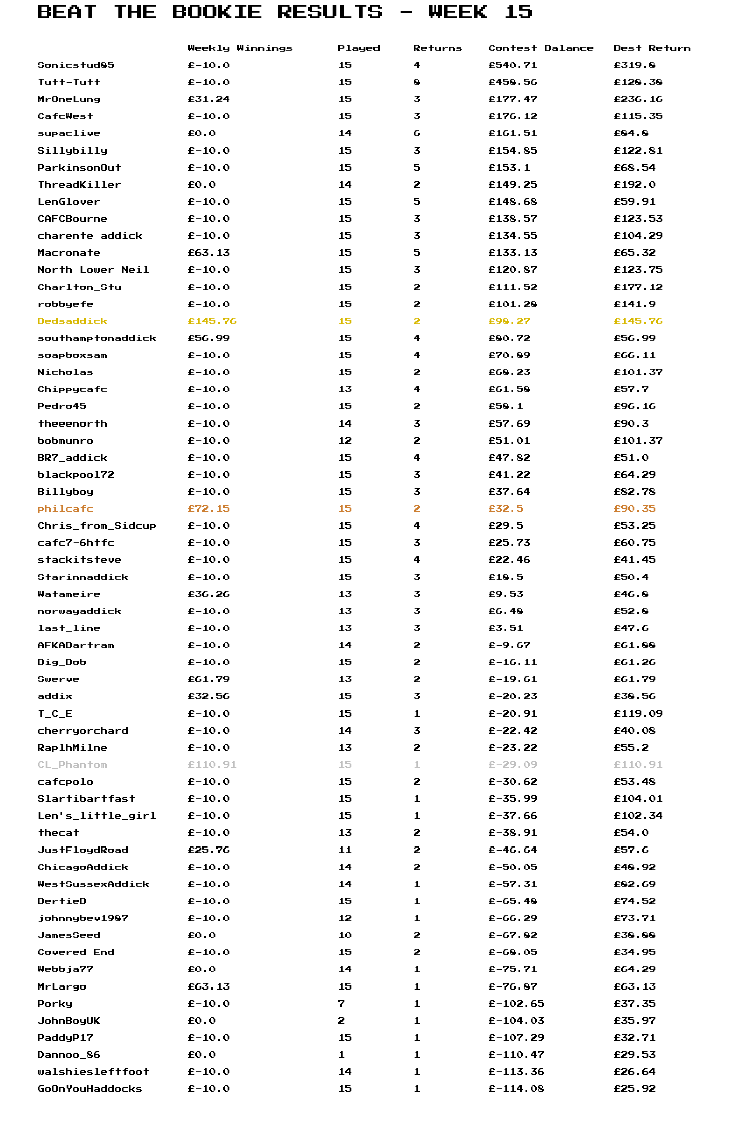 BEAT THE BOOKIE 2025/26 - Week 15 results & Week 16 fixtures