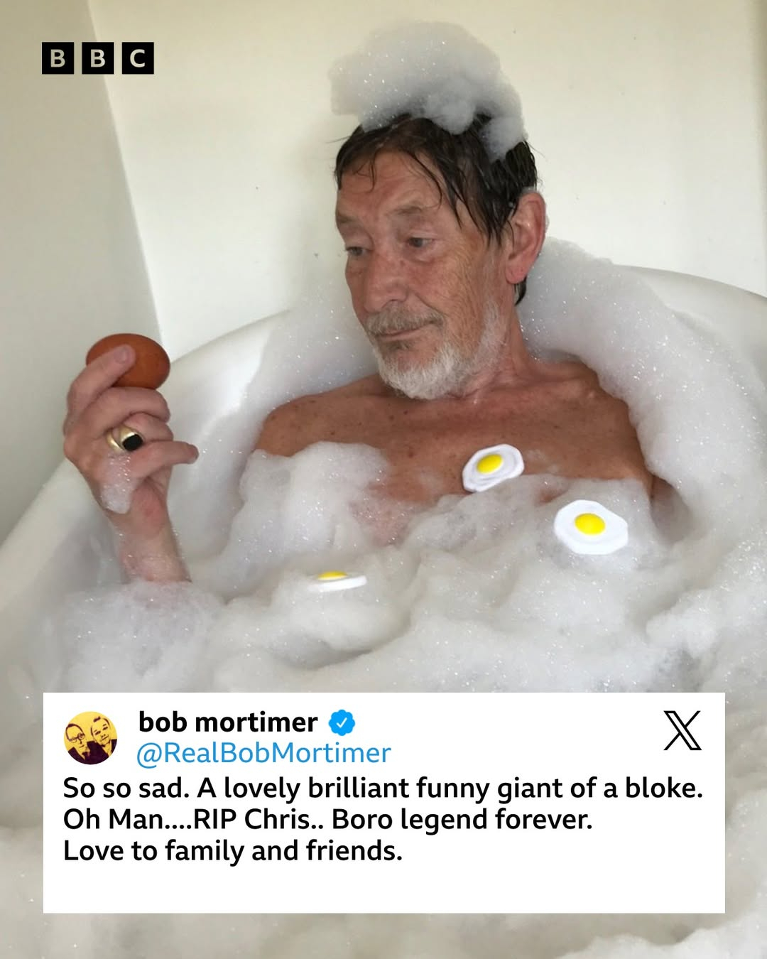 Bob told the story on Would I Lie To You that he was staying on Chris Rea's houseboat and Chris ran a bath for him and cracked an egg into the water for him. Hence the above.MrWalker said: