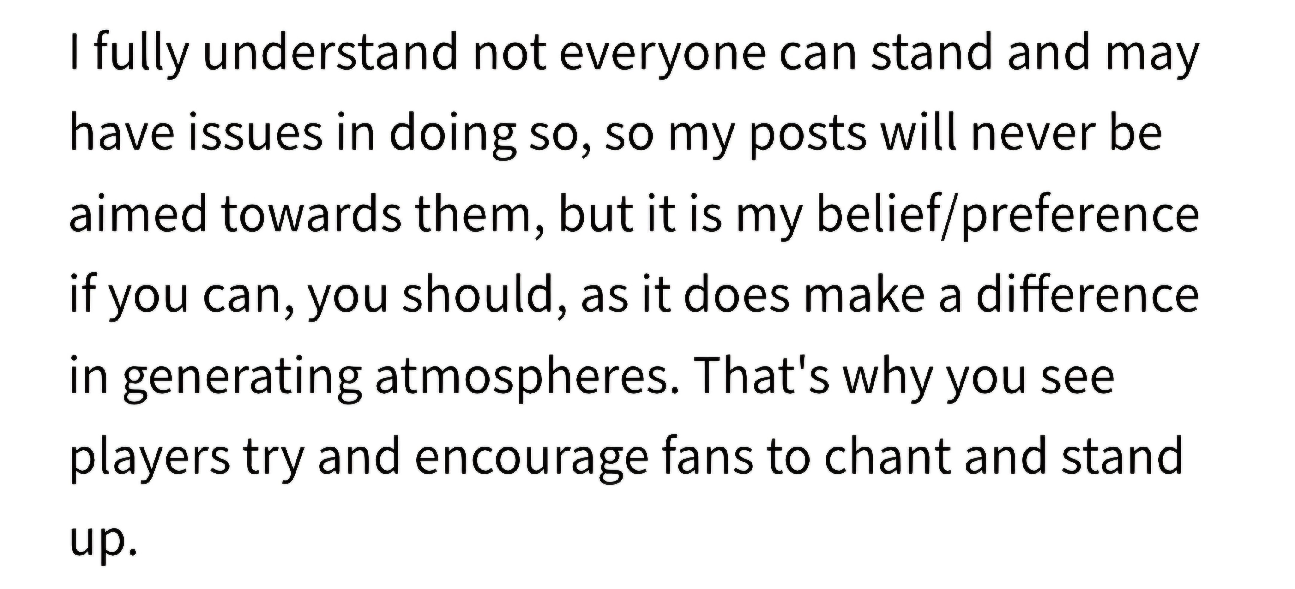 I fully understand not everyone can stand and may have issues in doing so, so my posts will never be aimed towards them, but it is my belief/preference if you can, you should, as it does make a difference in generating atmospheres. That's why you see players try and encourage fans to chant and stand up.