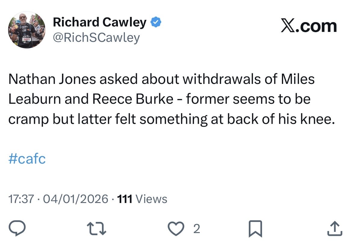 Think on the 90 mins a fair result don’t think either team done enough in tough conditions to win it … but frustrating that both their goals were down to Campbell not doing the simple job of stopping a cross into our box .. Burke going off changed the games so did our subs .. seem to affect us more … if we could have gone in at 2-0 I think that would have been different, but it’s a good point ….