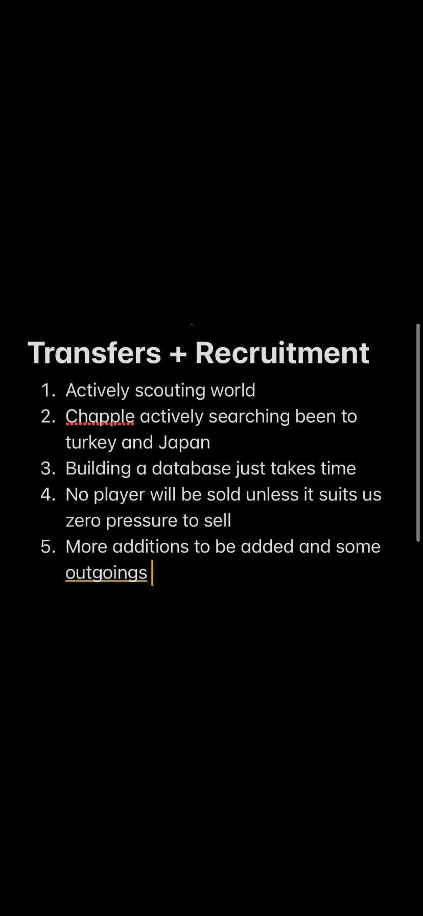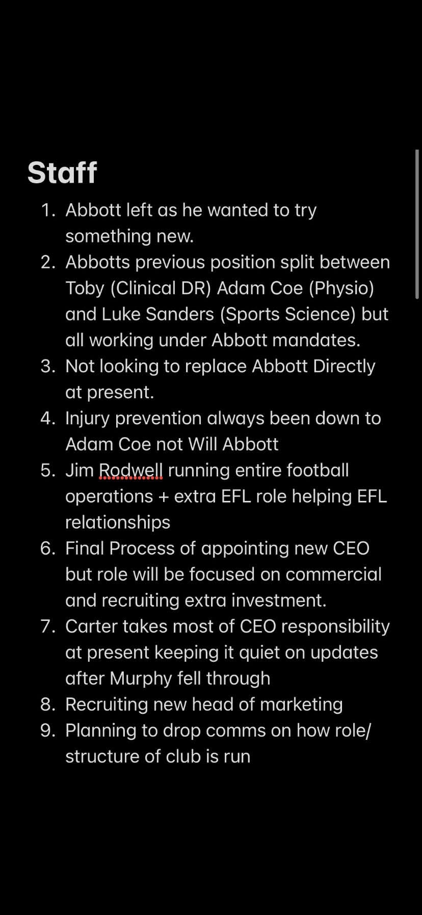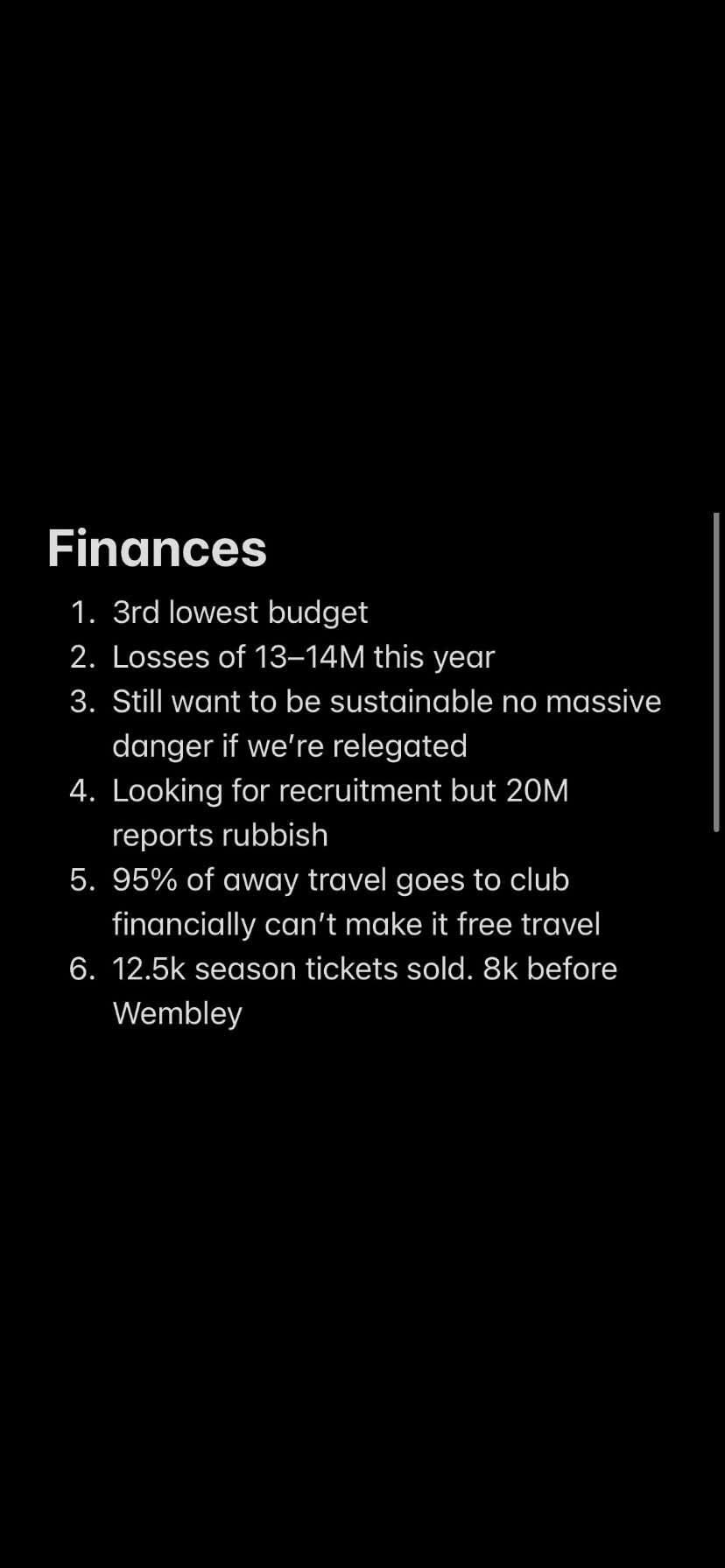 3. long list of things to fix / improve in and around the stadium but won’t spend hugely whilst we don’t own it - maybe the PA system will get looked at this summer