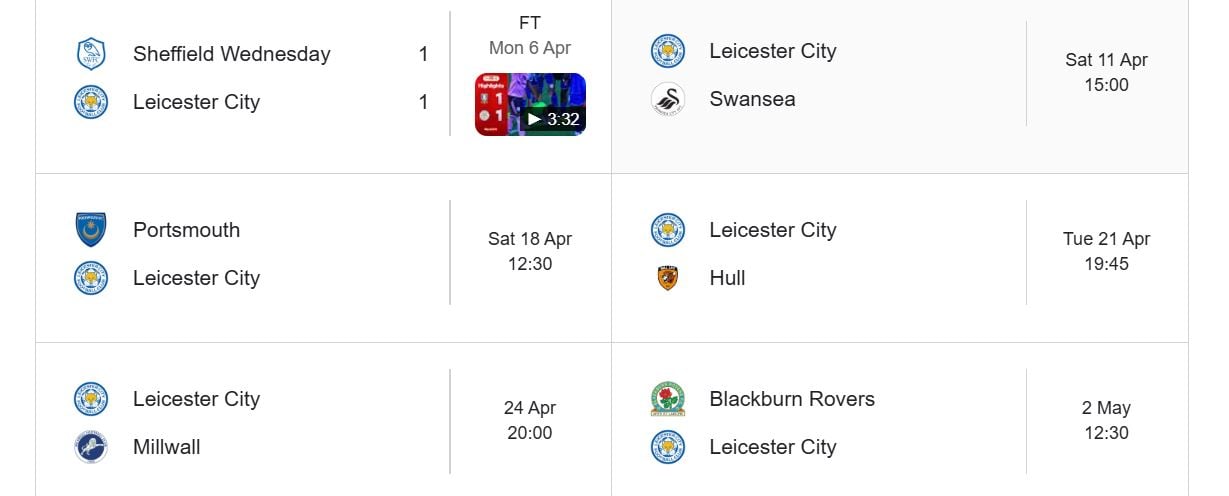 2nd May will be the exact 10-year anniversary of them sealing the Premier League title in 2016 and almost (but not quite) the 5-year anniversary of them winning the FA Cup in 2021.swords_alive said:Remaining fixtures- After Swansea on Saturday they have a key game against Portsmouth, then 2 tough ones at home but finish with Blackburn away. Still in their hands to get out of it i think but the next defeat could break any spirit they have left.