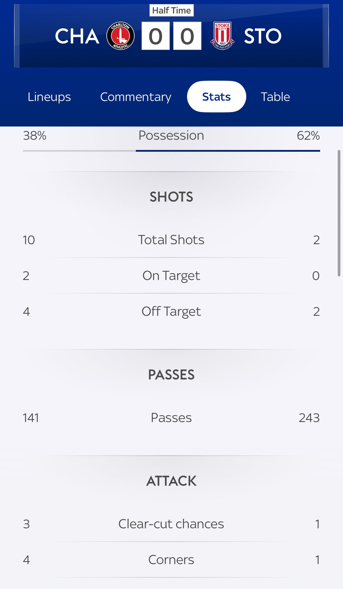 Enjoyable first half. We're dragging Stoke down to our level and not quite beating them with experience. Jones hitting the bar and Dykes having a goalbound shot cleared were our best chances and we need to keep creating them in the second half. What is clear is that Stoke are absolutely hating playing us and I think that's hilarious. More of it