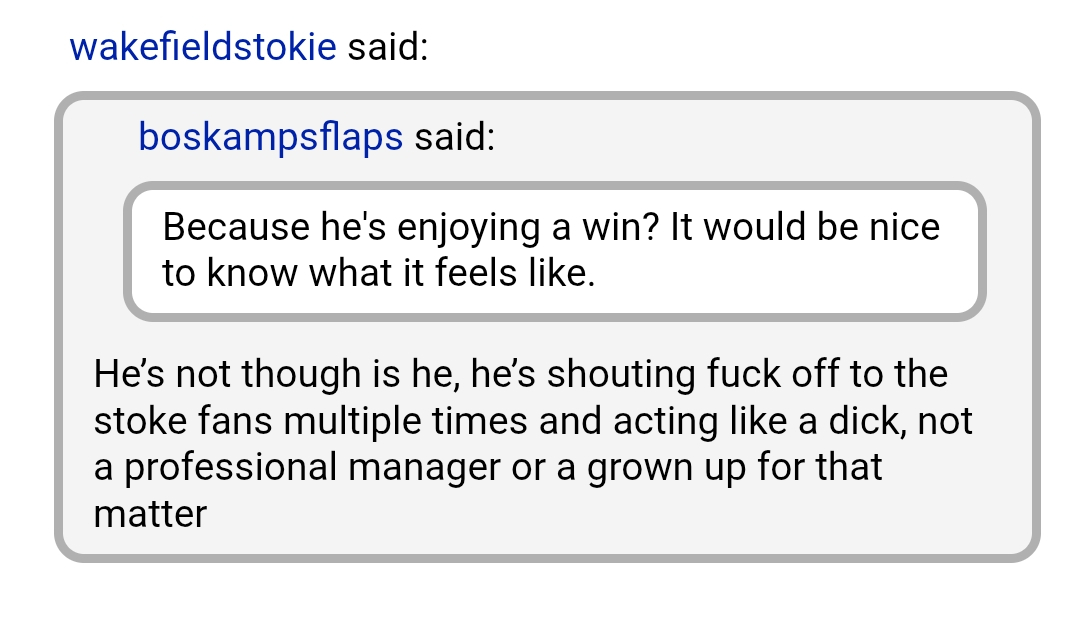 Finally, did anyone notice NJ go up to Stoke manager on the pitch and he leaned into his face like a madman and said something....oh how is love to hear exactly the words uttered.