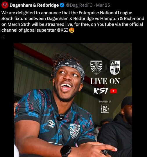 YouTuber KSI has bought a minority stake in Dagenham & Redbridge and says he wants to take the sixth-tier club to the Premier League.