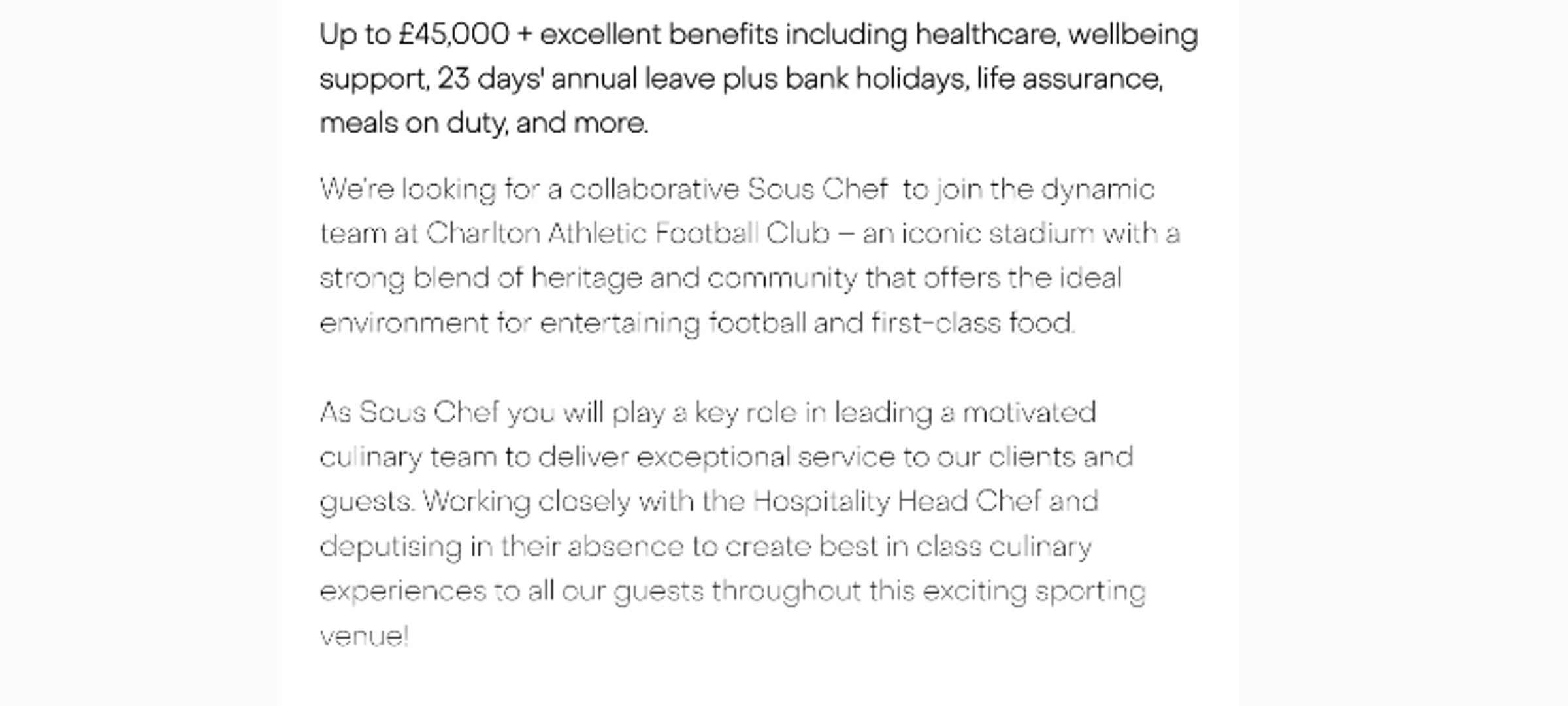 Here's an advert for a full-time Sous Chef for the Stadium. https://jobs.compass-group.co.uk/job/757958461 -