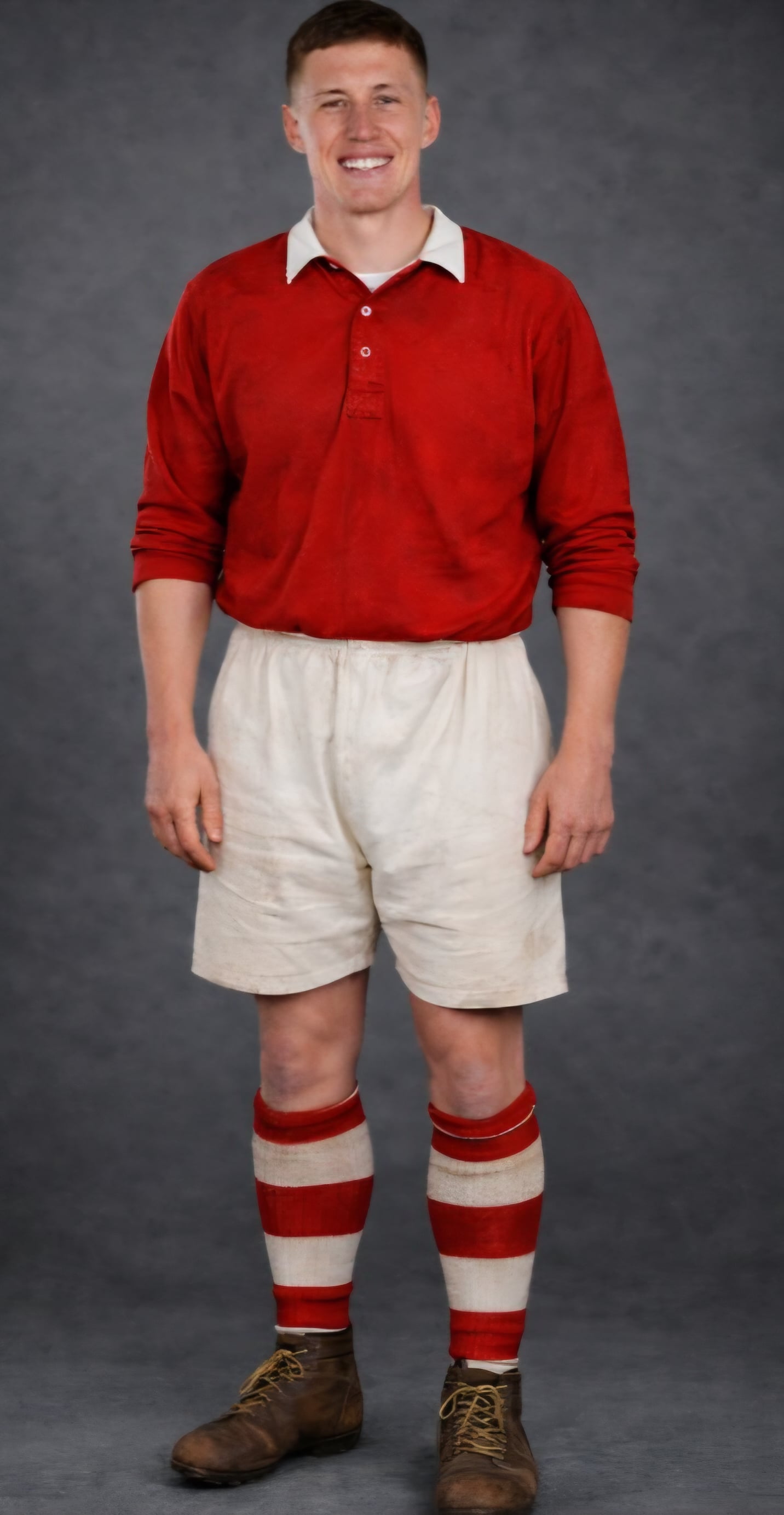 Skipper Greg Docherty "wearing" Sid O'Linn's 1950 shirt, Stuart Leary's 1950s boots and Peter Croker's 1947 FA Cup Final socks..