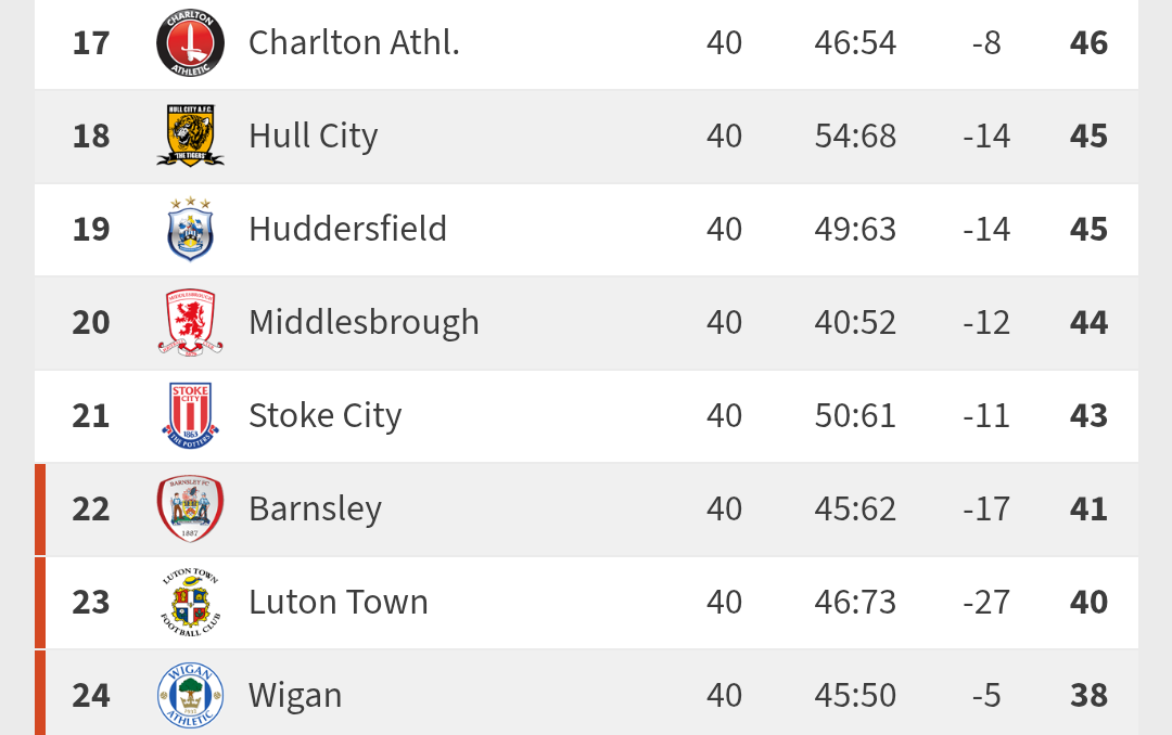 Can't see how this is a meaningful comparison... only Charlton now with Charlton then. Surely the comparison should be the "gap" between 17th and 22nd? Then five points, with six games to play... Now eight points with six games to play. Still looks like poo-poo time....MrBurns said:After 40 games last time we were in the championship. We are 2 points better off