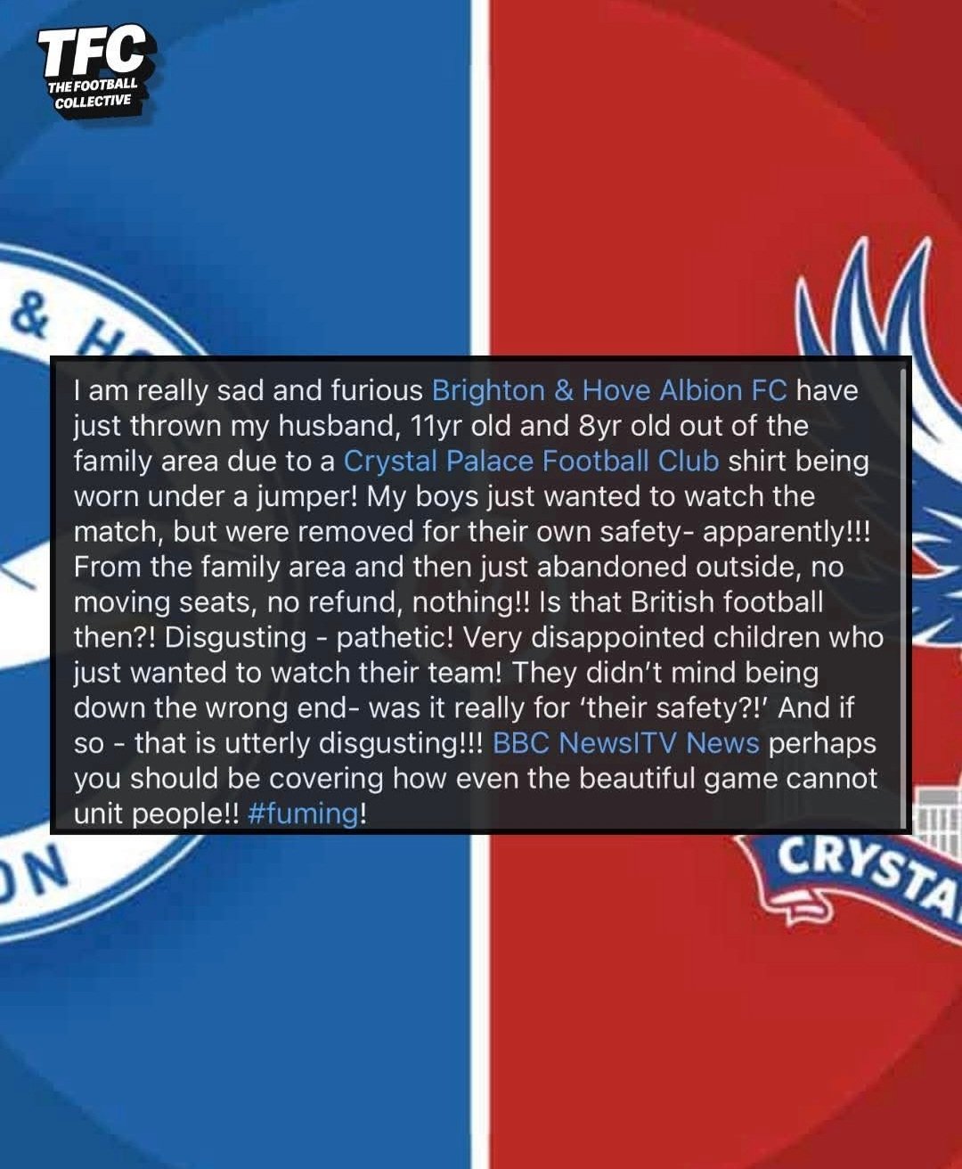 It's just so stupid. " Derby" and you're trying to sneak in the home end in palace shirts of course you're getting kicked out.11