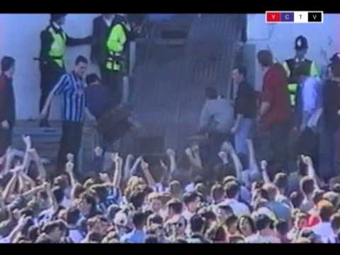 Moving to a new ground is never universally popular amongst fans but when Brighton moved ground after 95 years it was universally unpopular - their Goldstone Ground had been sold to make way for a retail park but they had no shiny new stadium to move to! Fans accused the owners of asset-stripping and breaking promises which brought together supporters from all parts of the country to oppose what was happening on the south coast. That protest culminated in a pitch invasion at what was due to be their last match at the Goldstone (although they subsequently agreed to stay for another season) against York City on Saturday April 27th 1996. At 3.16 fans invaded the Goldstone pitch from both ends and after both crossbars were pulled down the match was abandoned.