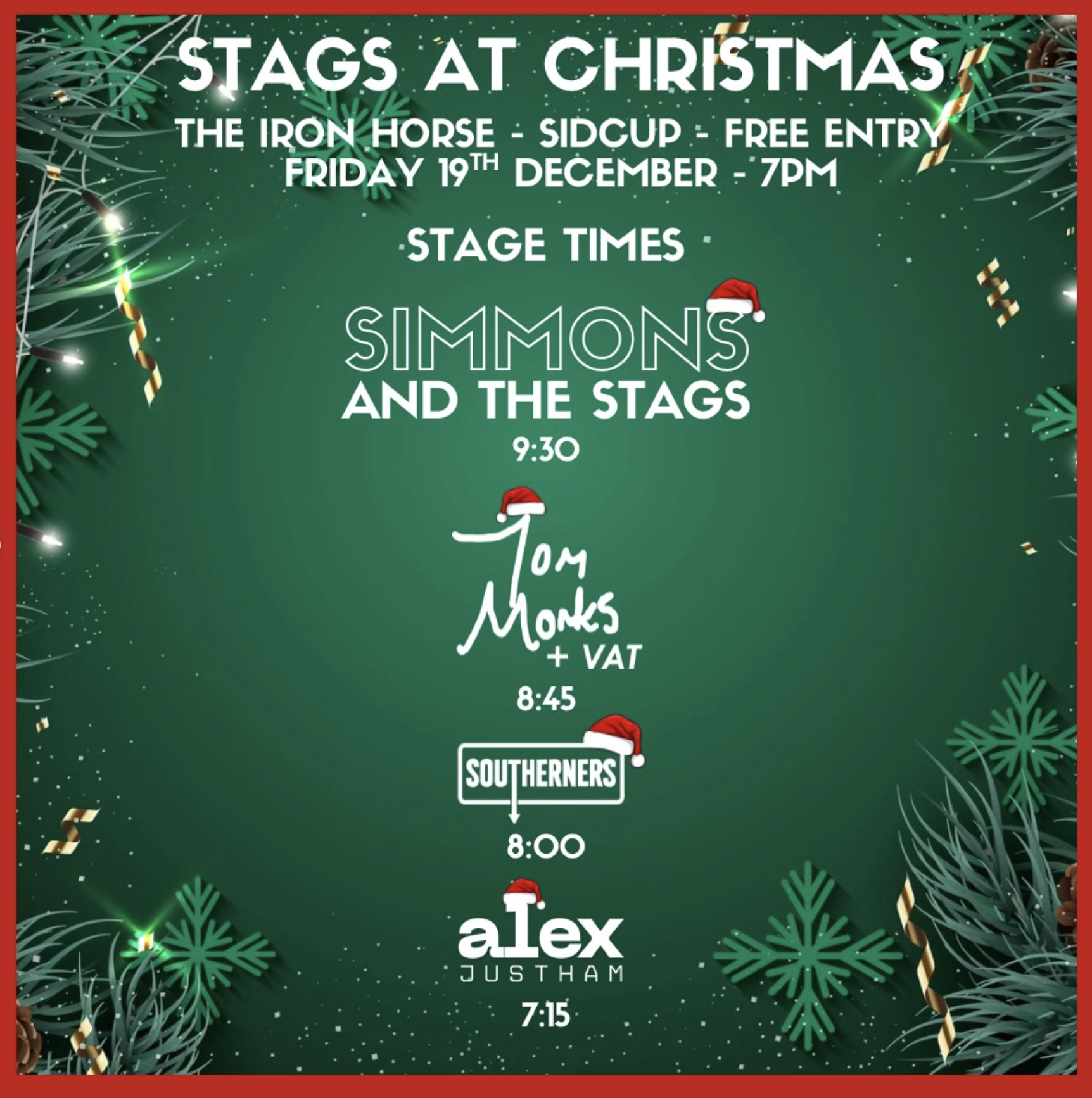 If you're free Friday 19th December and looking for a local gig. Then my band (Simmons And The Stags) are playing The Iron Horse in Sidcup, it's free entry and we've got some great support of independent musicians.