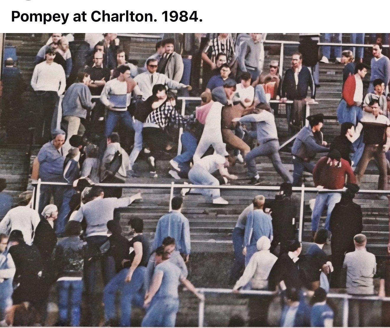 Remember that game - think i was 13 and not allowed to go in the covered end for games like pompey that might be a bit 'tasty' - was standing with my dad etc on the east terrace (which turned out to be the battle ground) as the goalkeeper from my sunday side (a big lad for his age) went tearing past with a scarf wrapped round his face - with a load of others heading towards the away end as pompey spilled out of that. A bit later in the season he got sent off for threatening to stab the ref - He was from Thamesmead.Solidgone said:Anyone here involved?