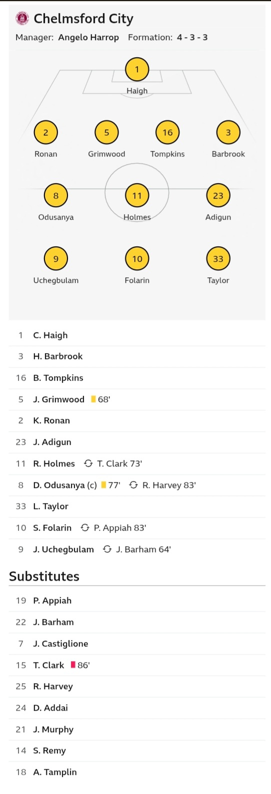 The prick's just been sent off for a violent tackle, studs up, caught the oppo in the midriff. Chelmsford now losing 0-2 to WSM.