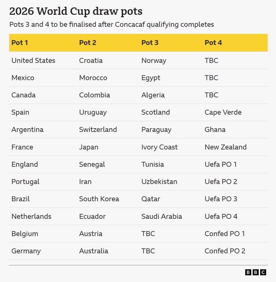 TBC for Pot 3 or Pot 4: South Africa, Jordan and tonight’s three CONCACAF qualifiers.