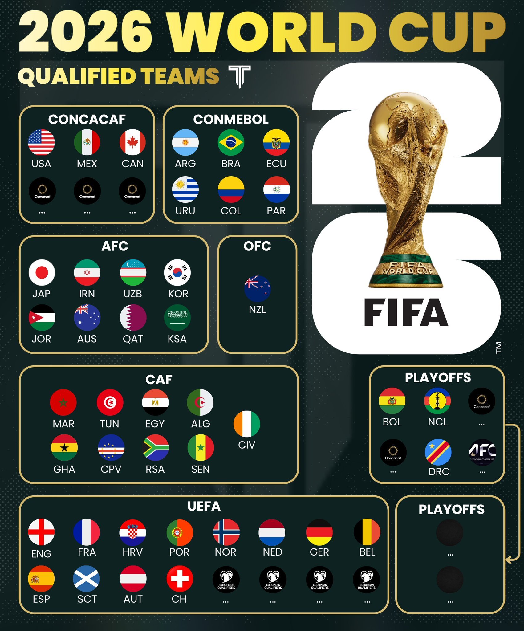 Six inter-continental playoff teams are: Iraq, DR Congo, Jamaica, Suriname, Bolivia, New Caledonia.
