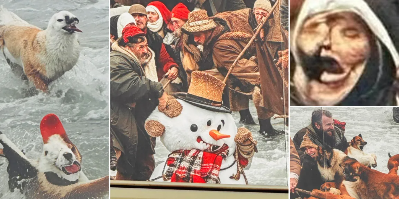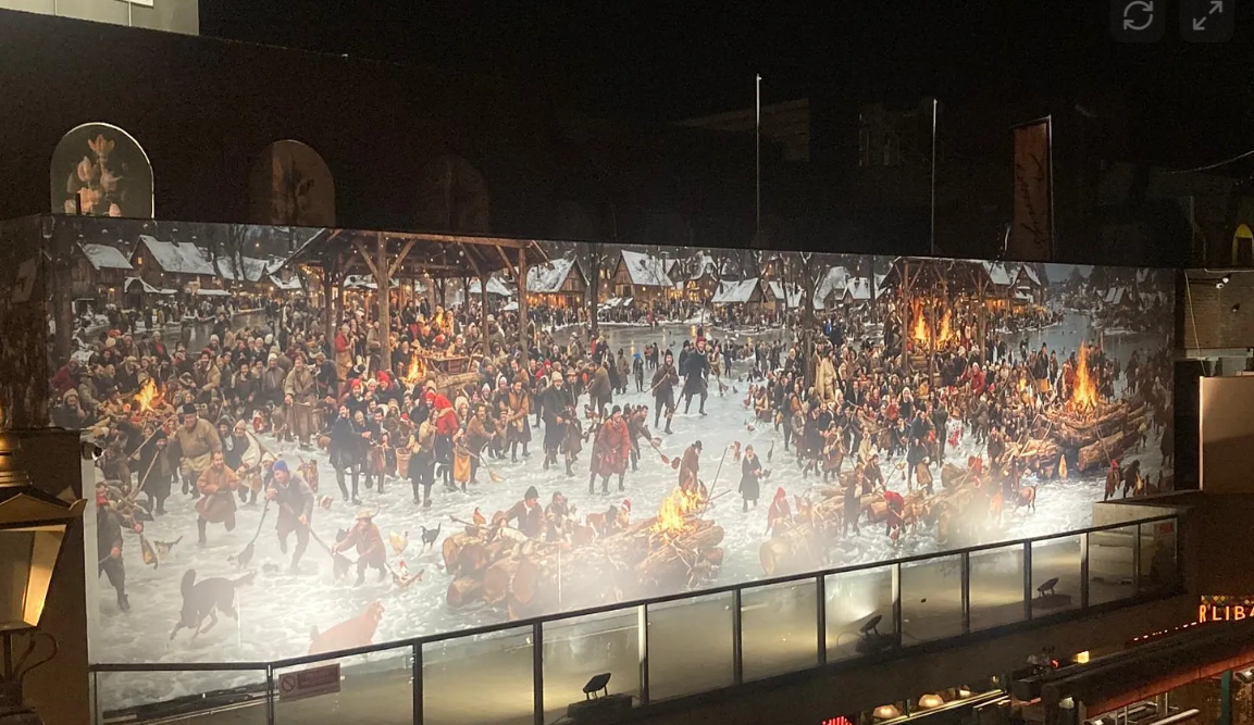 ... but closer inspection reveals something odd about this modern recreation of an ancient frost fair of the River Thames. Dogs blurred into chickens, humans became animals, and there was a truly grotesque snowman. In one section a penguin appears to be on fire.