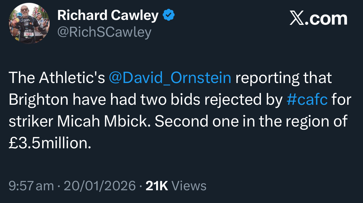 Micah Mbick - 20/1/2026 The Athletic reporting Brighton have had 2 bids for him rejected (p12)