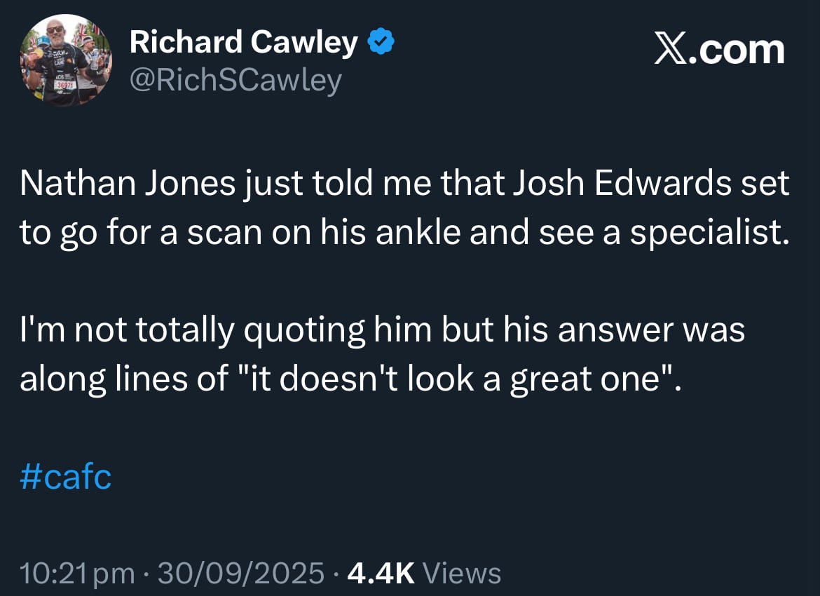 Scoham said:Crispywood said:Jones saying it was ankle ligament damage leaves a recovery timeline very open depending on the severity it can be 6 weeks to the end of the season. Hoping the fact he was able to walk over and take a long throw in before he could continue will mean it’s more likely the former1