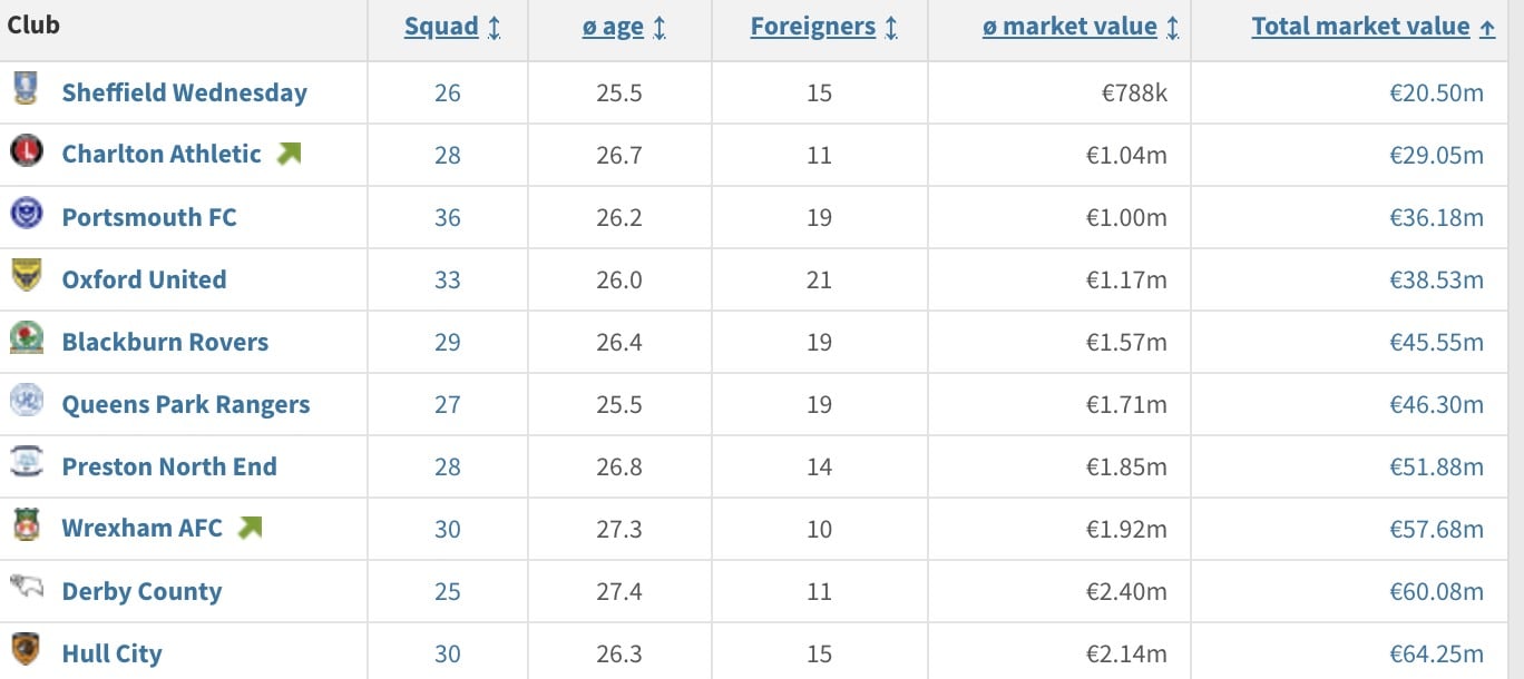 I don't particularly like it as a framework as there's a lot of guesswork involved but here is Transfermarkt's opinion of the lowest 10 squads by squad value. It suggests our squad is pretty weak compared to those we are scrapping it out withpaulsturgess said:We have a low budget but don't think we definitively have a bottom 3 budget, Preston have a similar or maybe even lower budget than us and actually budget is highly relevant but ultimately you have to judge a teams performance Vs the players available to them on the pitch not their budget