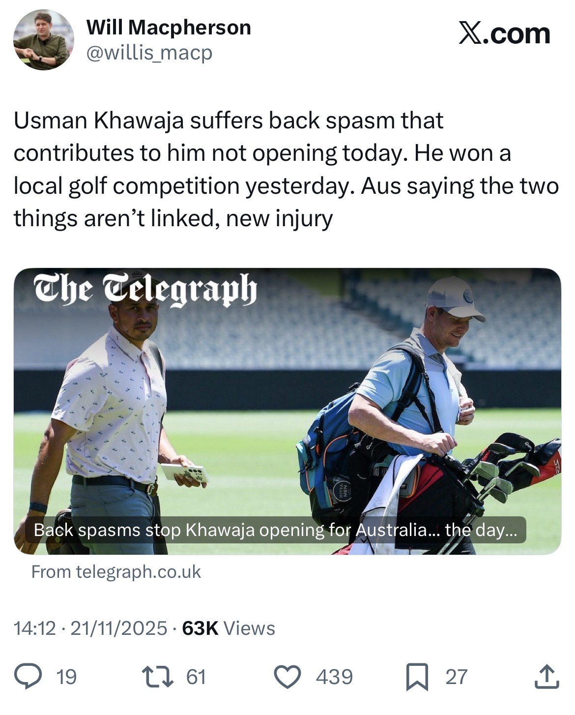 • Australia paying the price here for effectively letting the players pick the team for them. Warner was allowed a farewell tour (wonder why he got treated with kid gloves?), and the idea of Australian selectors of the past allowing a 38 year old Usman Khawaja to play on this long would be unthinkable. That has created instability at the top, which means that Smith and ML are having to come in and face bowlers and a ball that is hard and fresh.
