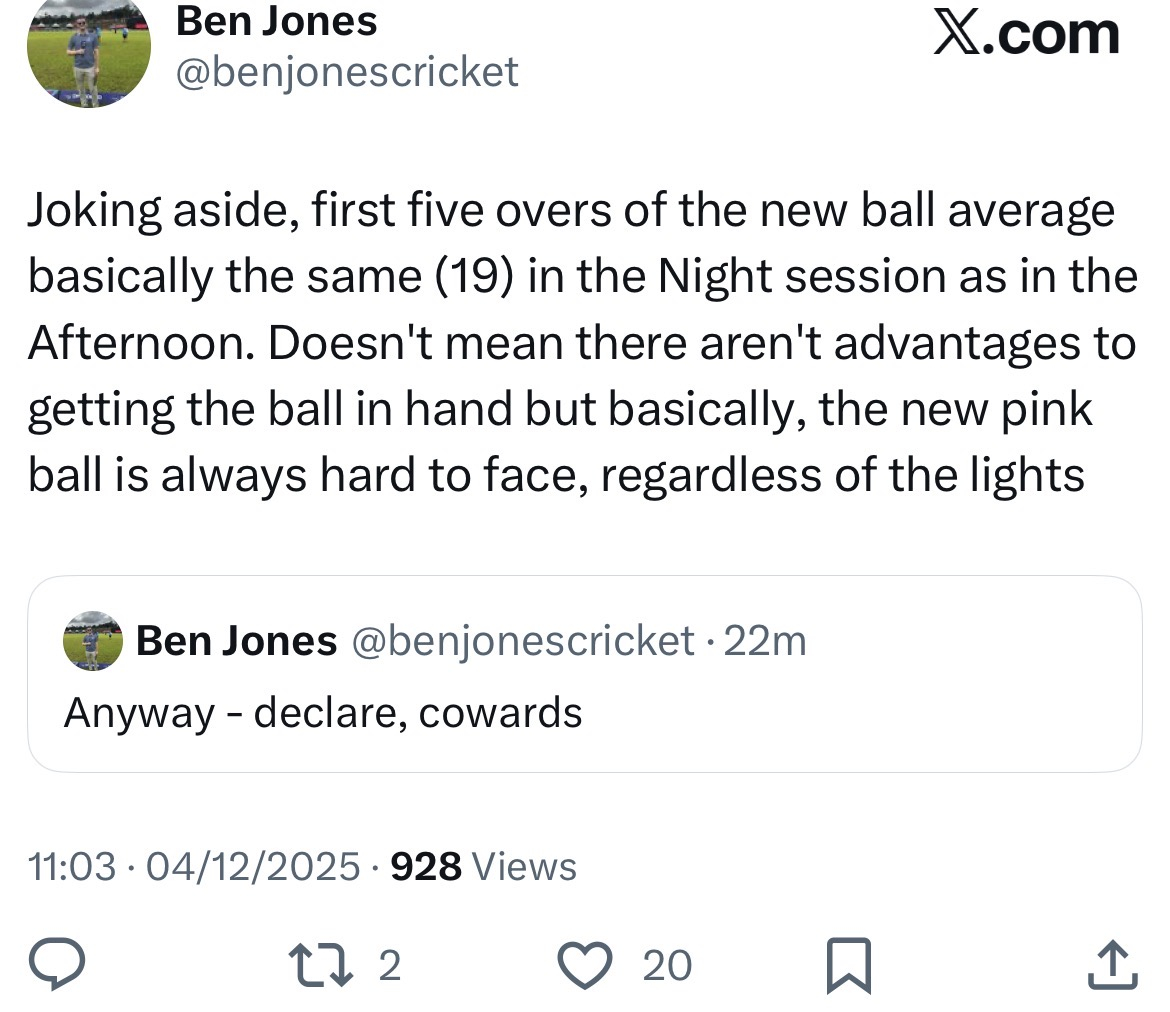 Yes. But the last time Stokes declared nine down in an Ashes Test with Root seeing it like a beach all, we lost. And Stokes was slaughtered, mercilessly by the usual suspects.Gravesend_Addick said:Is there an argument for declaring & having 20 minutes at them tonight?