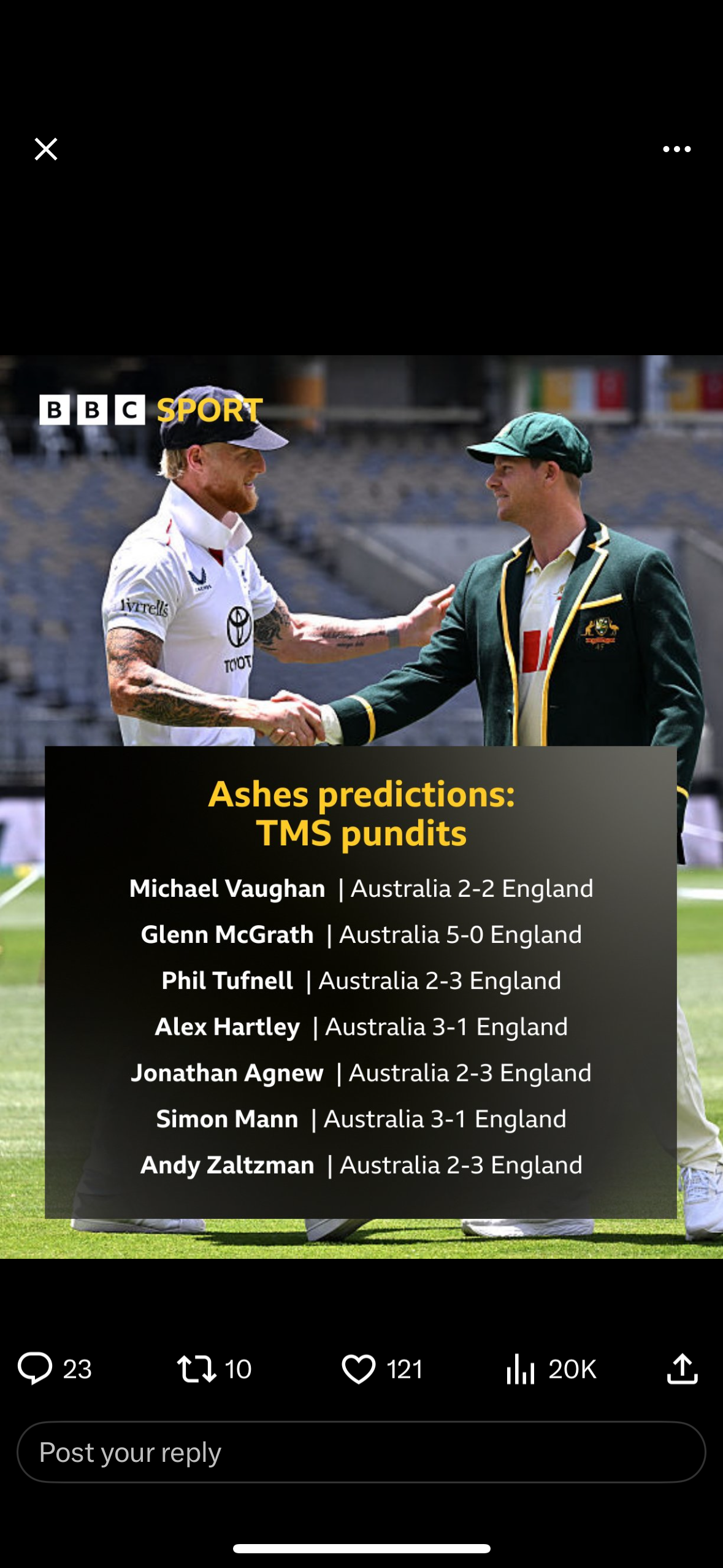 Not great predictions from most of these "pundits". Agnew's 3-2 to England is a bit at odds with his comments today about knowing in July that the approach was doomed to failure!