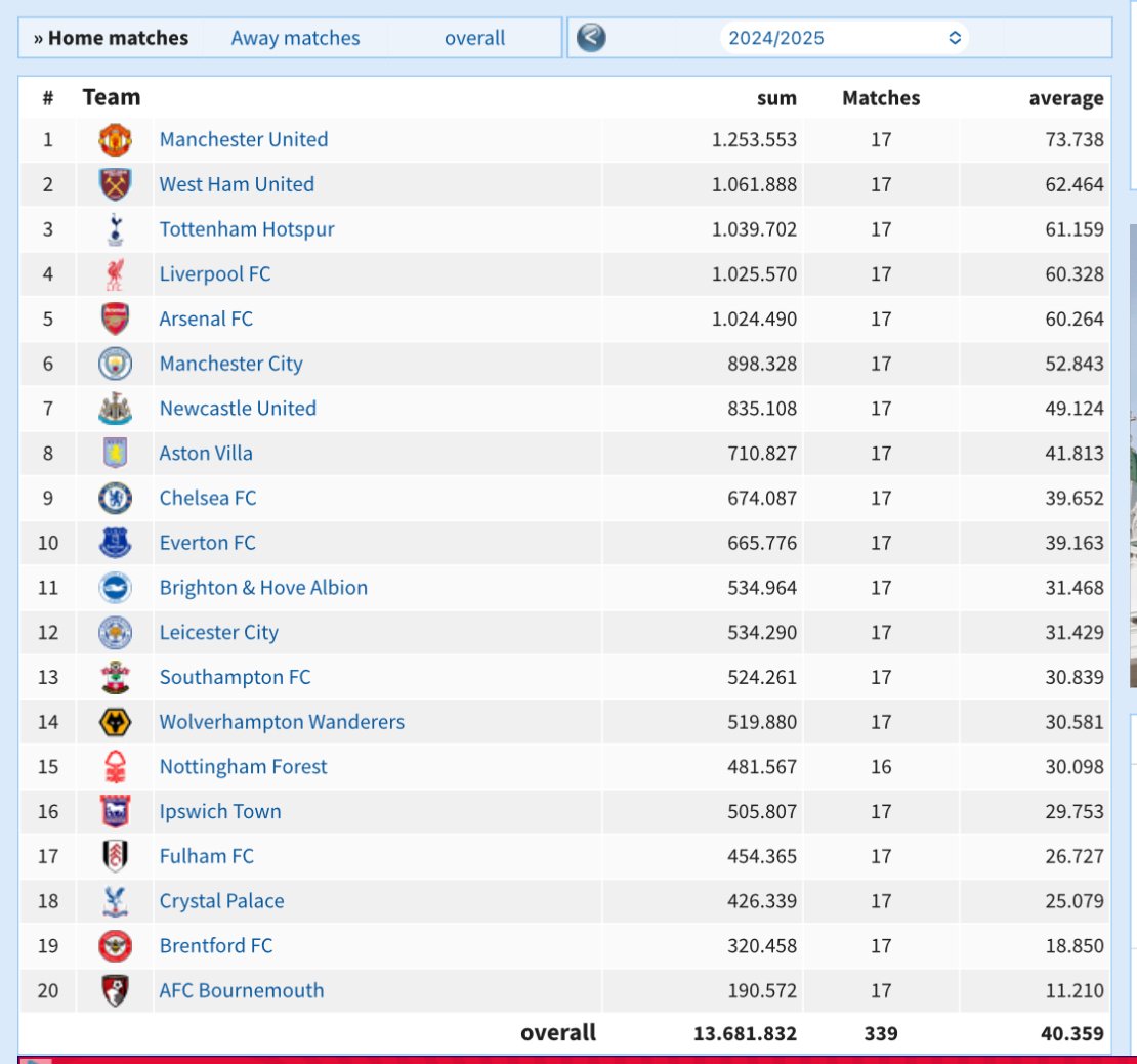 Palace’s figures not that impressive either given that most of their ‘support’ will be just there for the PL opposition. Obviously the ground capacity puts a cap on how many they could get but I didn’t realise there are only two grounds smaller than theirs in the PL