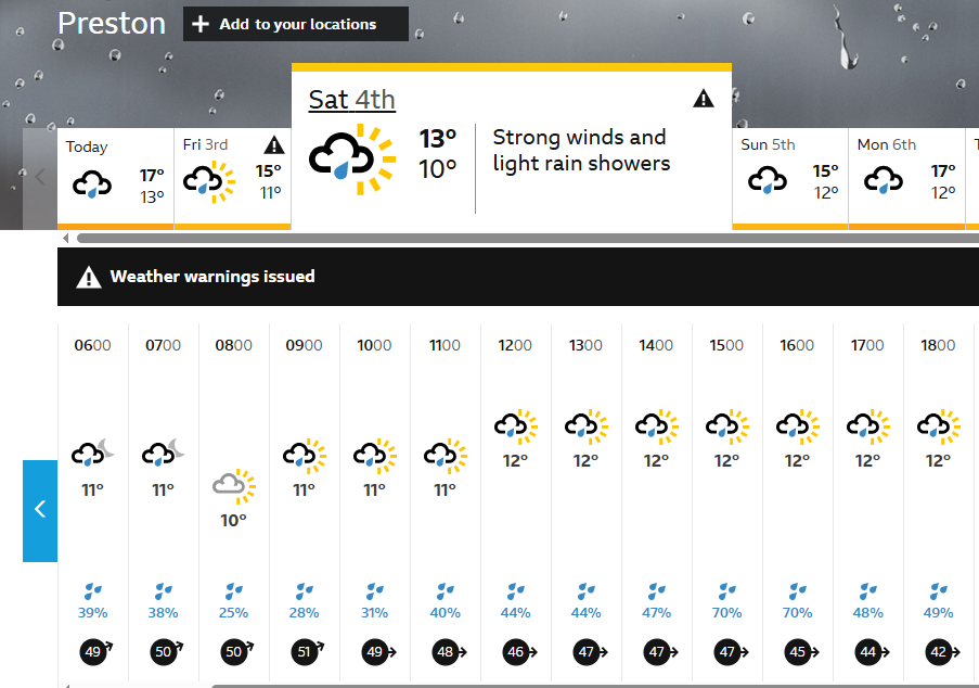 • The weather forcast isn't looking too bad, the heaviest rain is during the night, showers in the afternoon