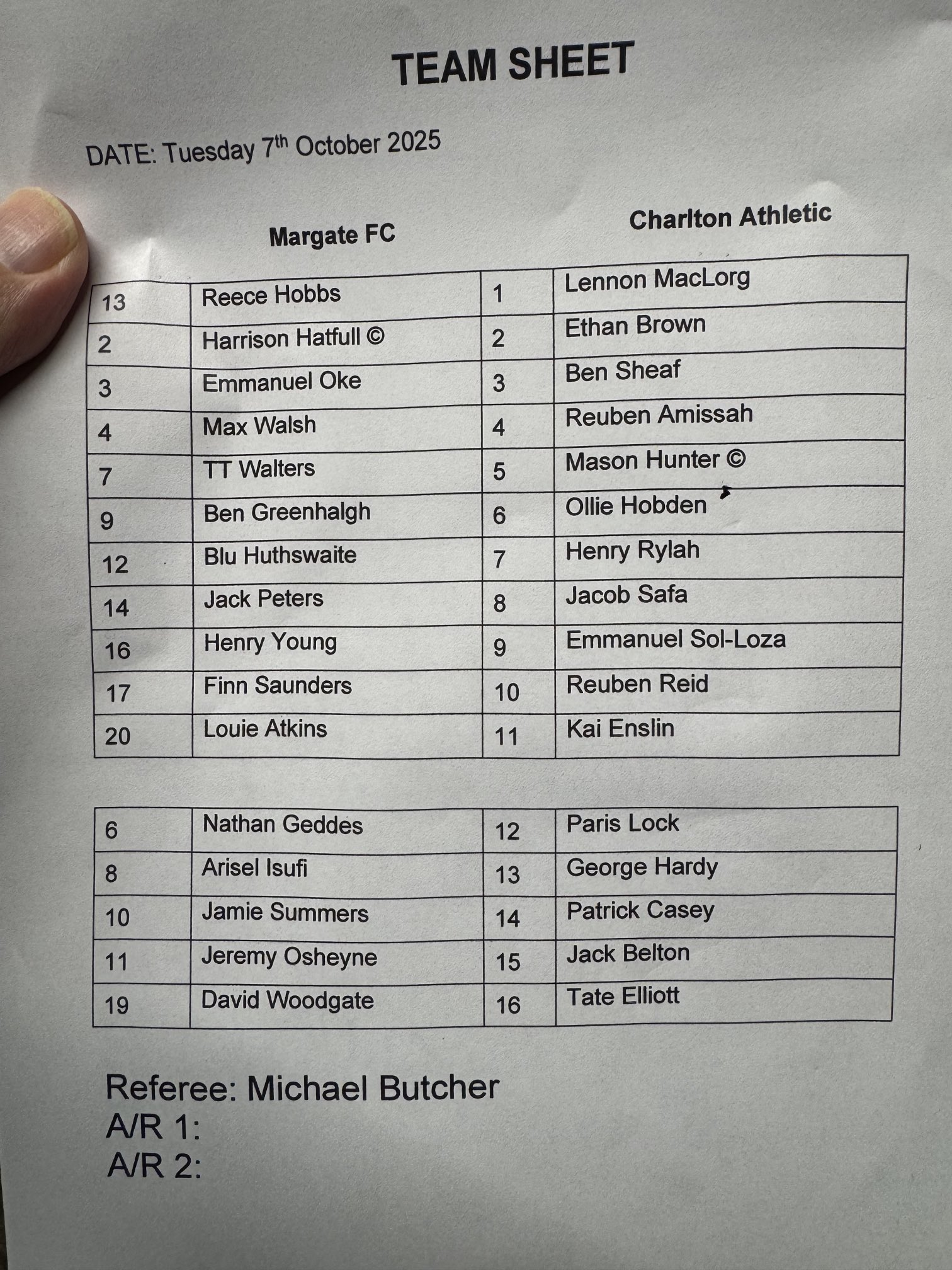 Here’s how our U21s line-up for tonight's Kent Senior Cup game against Margate: MacLorg; Hobden, Hunter (c), Trialist; Brown, Amissah, Safa, R.Reid, Enslin; Rylah, Sol-LozaSubs: Hardy, Lock, Casey, Belton, Elliott5