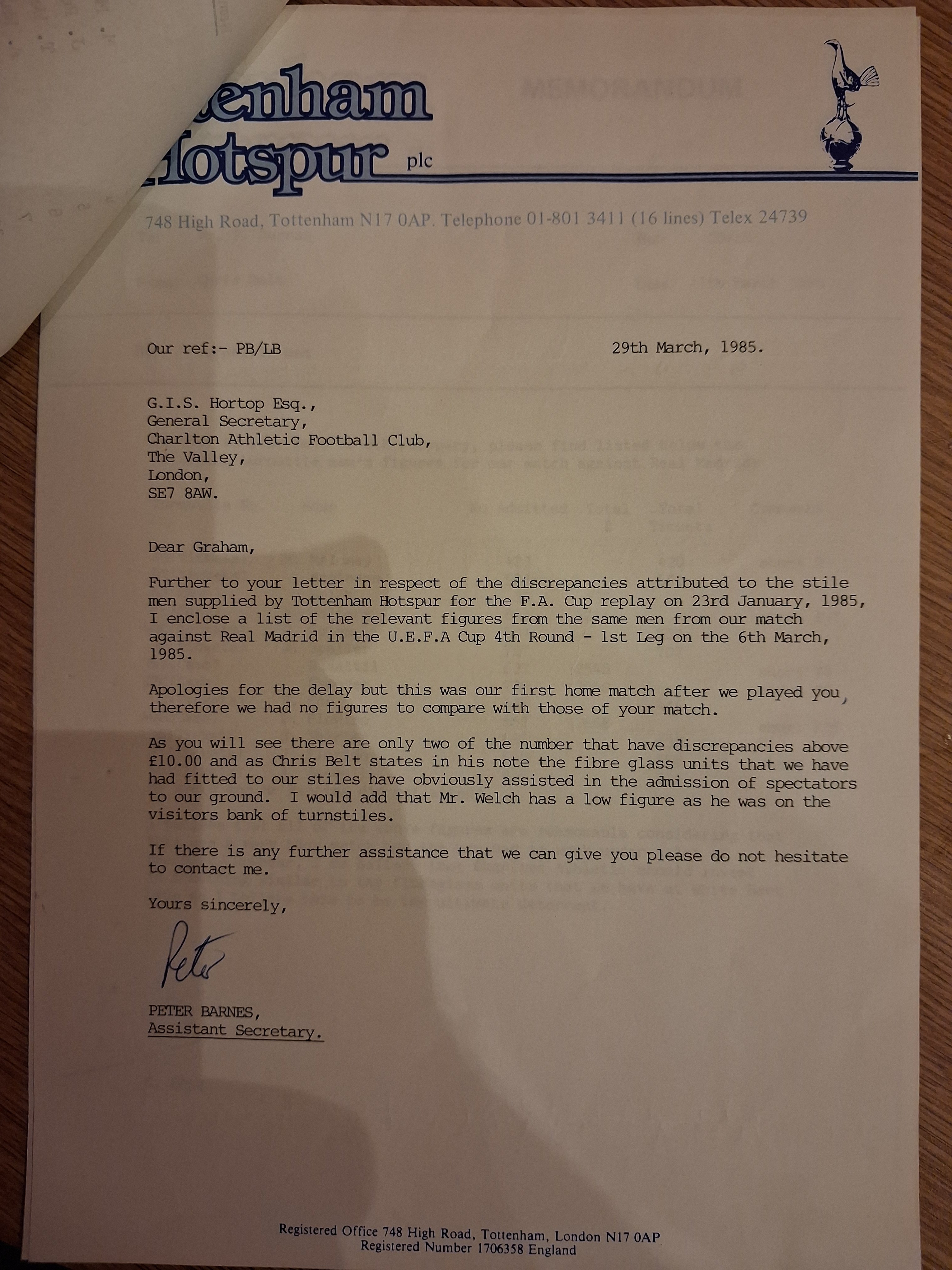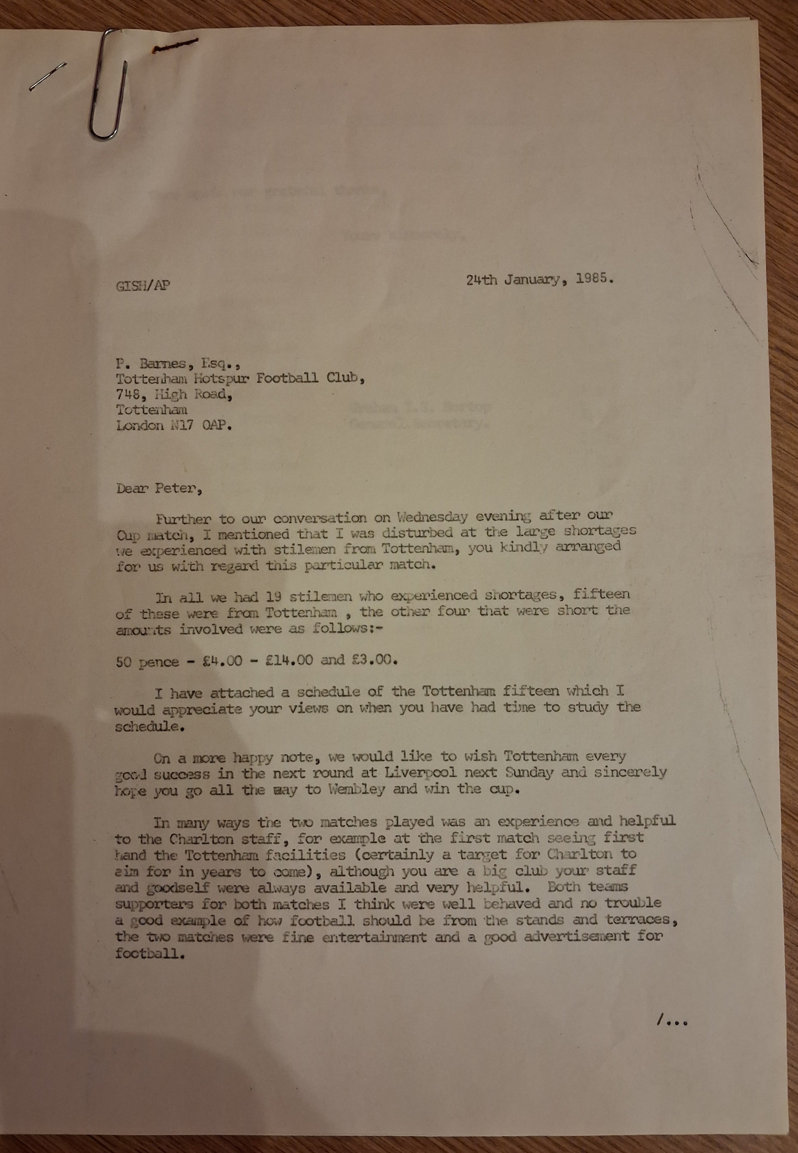Letters from our archive. Spurs lent Charlton some turnstile operators for the 1985 FA Cup replay but #cafc weren't happy with the "discrepancies" between the count and the money handed in by those operators. #thfc were having none of it.