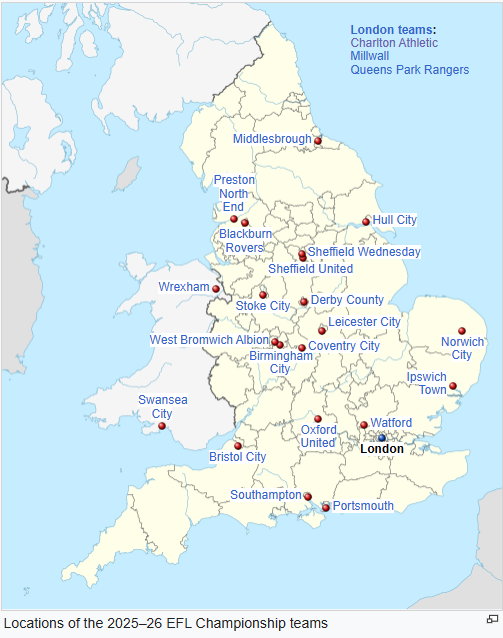 The Championship does have a lot of Midlands and Northern teams, not helped by there being a lot of London teams in the PL and a number of southern sides in L1 and L2.0 -