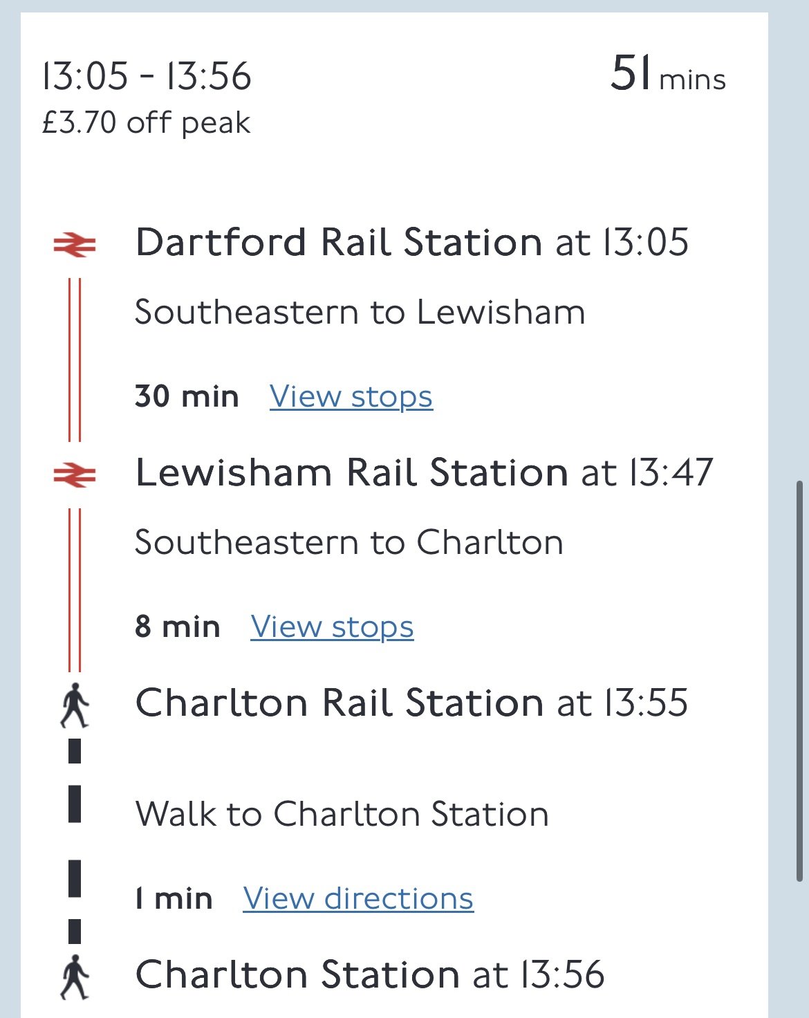 Assuming the journey planner is accurate, you can get the train to Lewisham, then change 1 stop to Charlton. That's what I'm doing from Gravesend.Greenhithe said:Looks like a train to Dartford then a cab then.