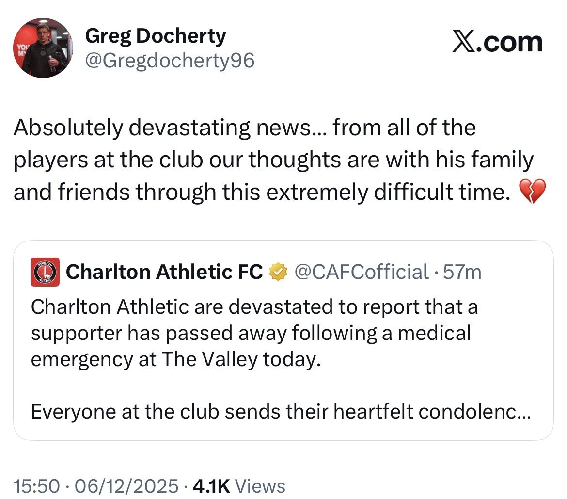Rest in peace to the Charlton Athletic fan that passed away this afternoon at the home game v Portsmouth