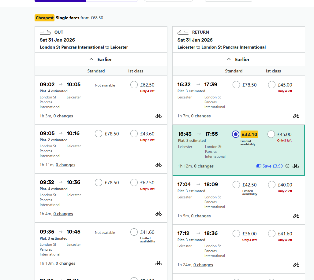 £55.40 on returns to St Pancreas from Leicester on 12 or 43 trainsZ and going out fron St Pancreas on the 05 and 35 trains apart from the 9.35 which is more expensive0 -