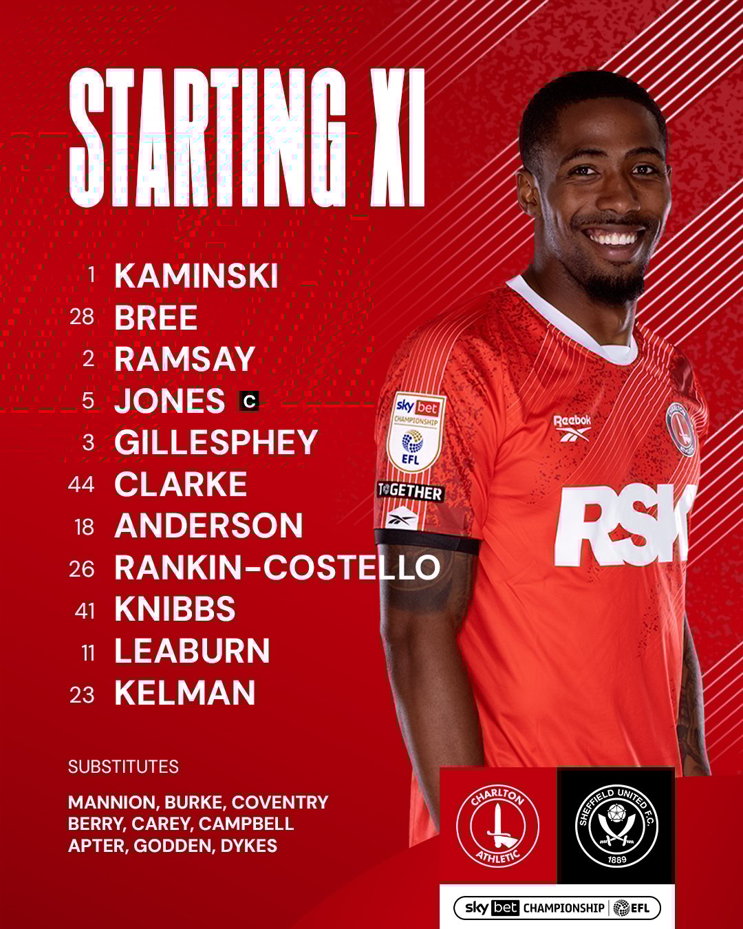 Charlton: Kaminski; Bree, Ramsay, Jones (c), Gillesphey, Clarke; Anderson, Rankin-Costello, Knibbs; Leaburn, Kelman