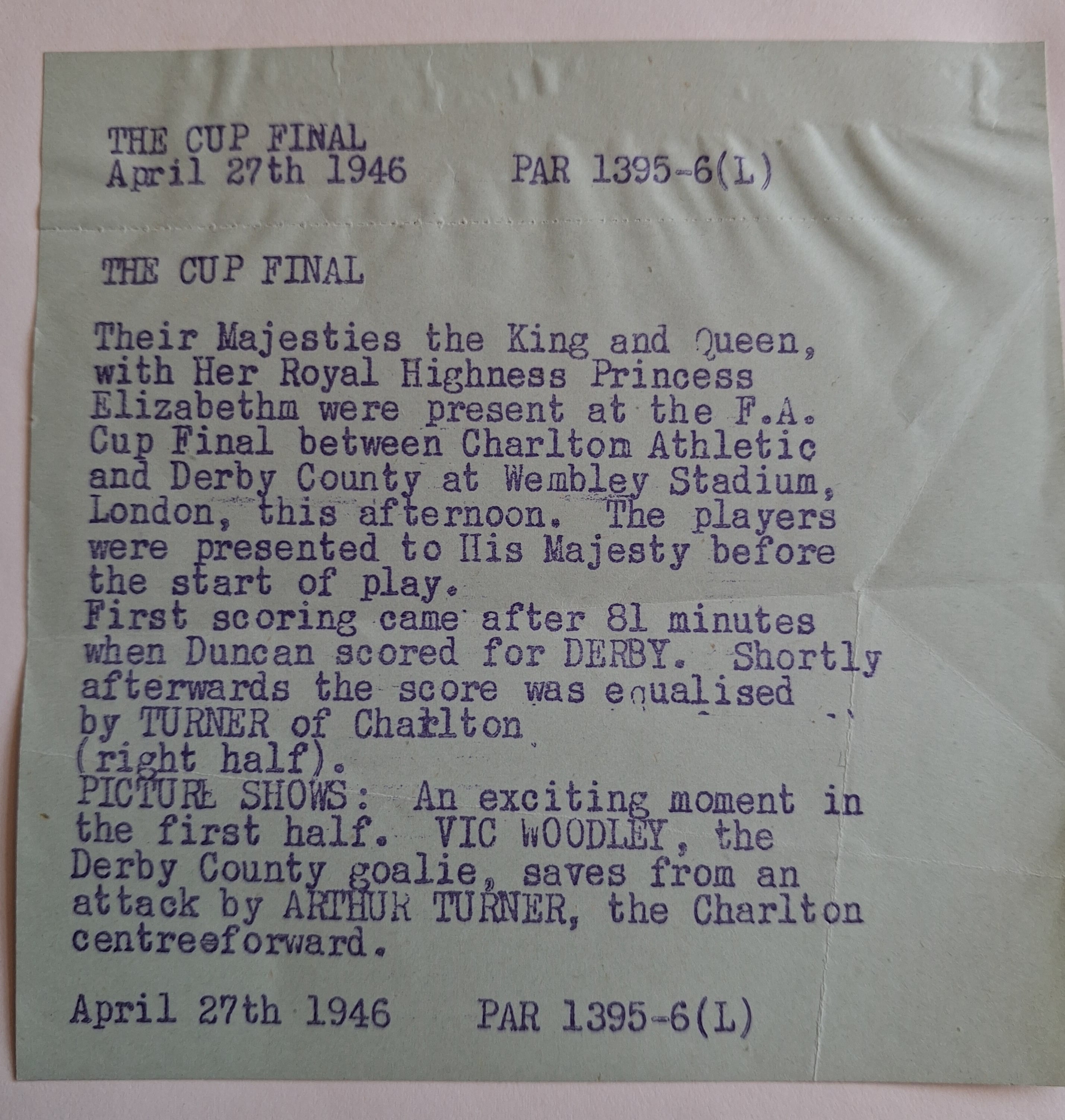 Original press photo from the 1946 Charlton v Derby FA Cup Final added to the museum's archive.